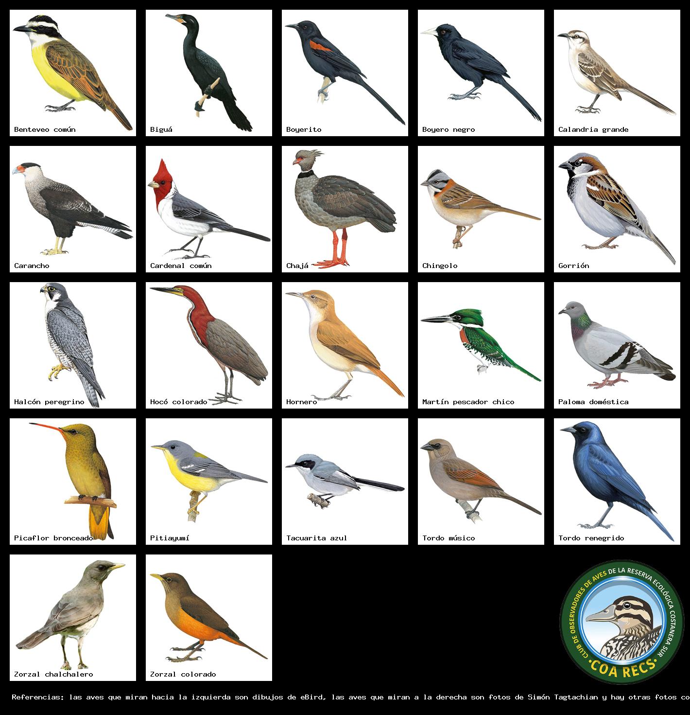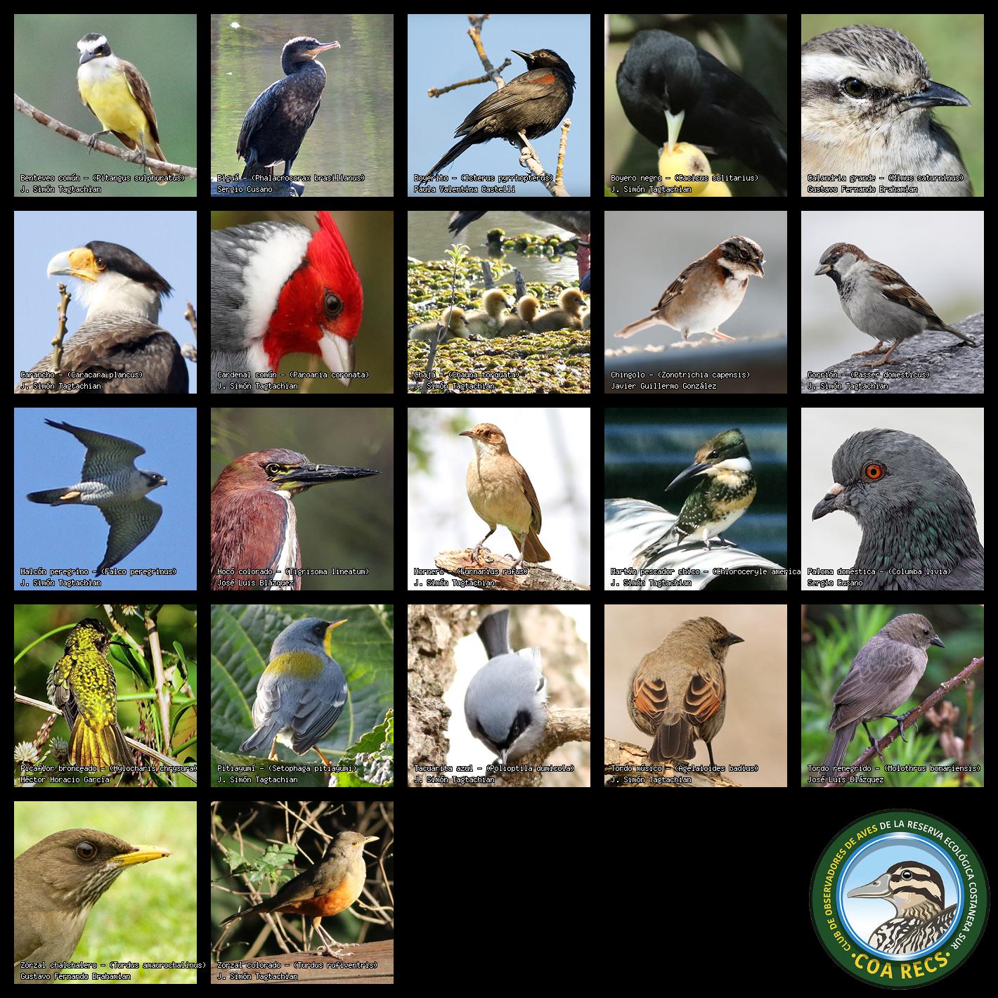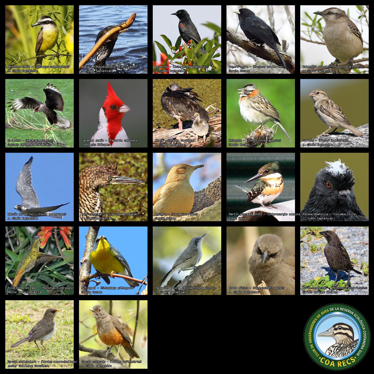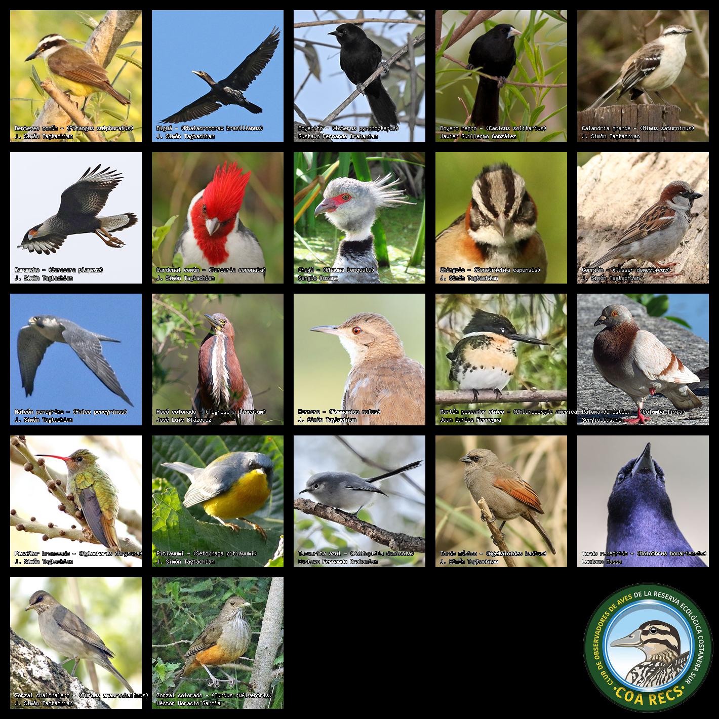 (Gavilán mixto, Carancho, Chimango, Benteveo común, Hornero, Carpintero real y Estornino pinto)