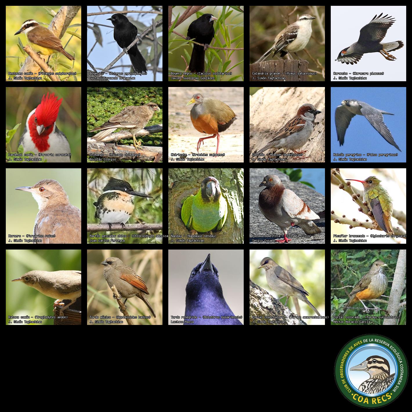 (Gavilán mixto, Carancho, Chimango, Benteveo común, Hornero, Carpintero real y Estornino pinto)
