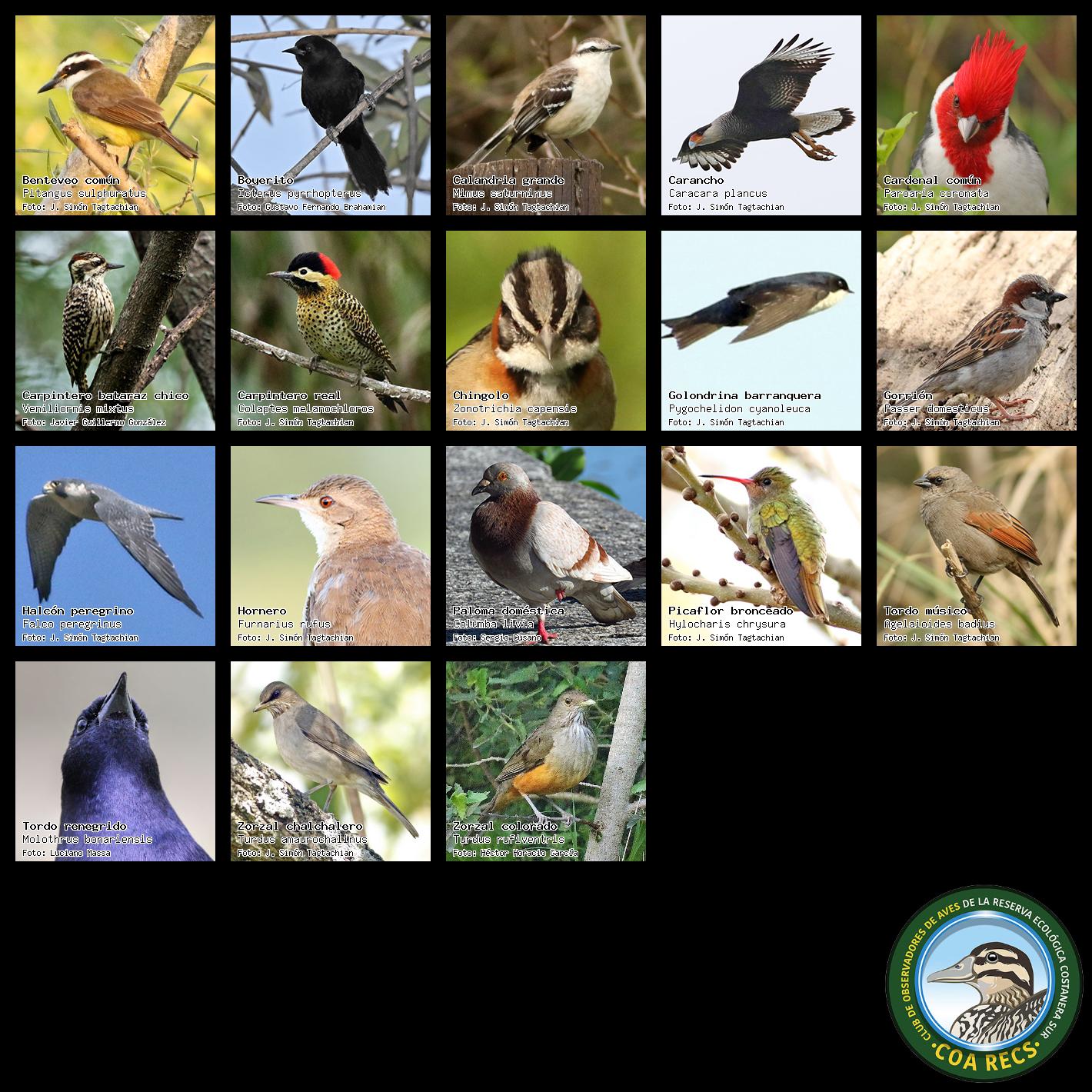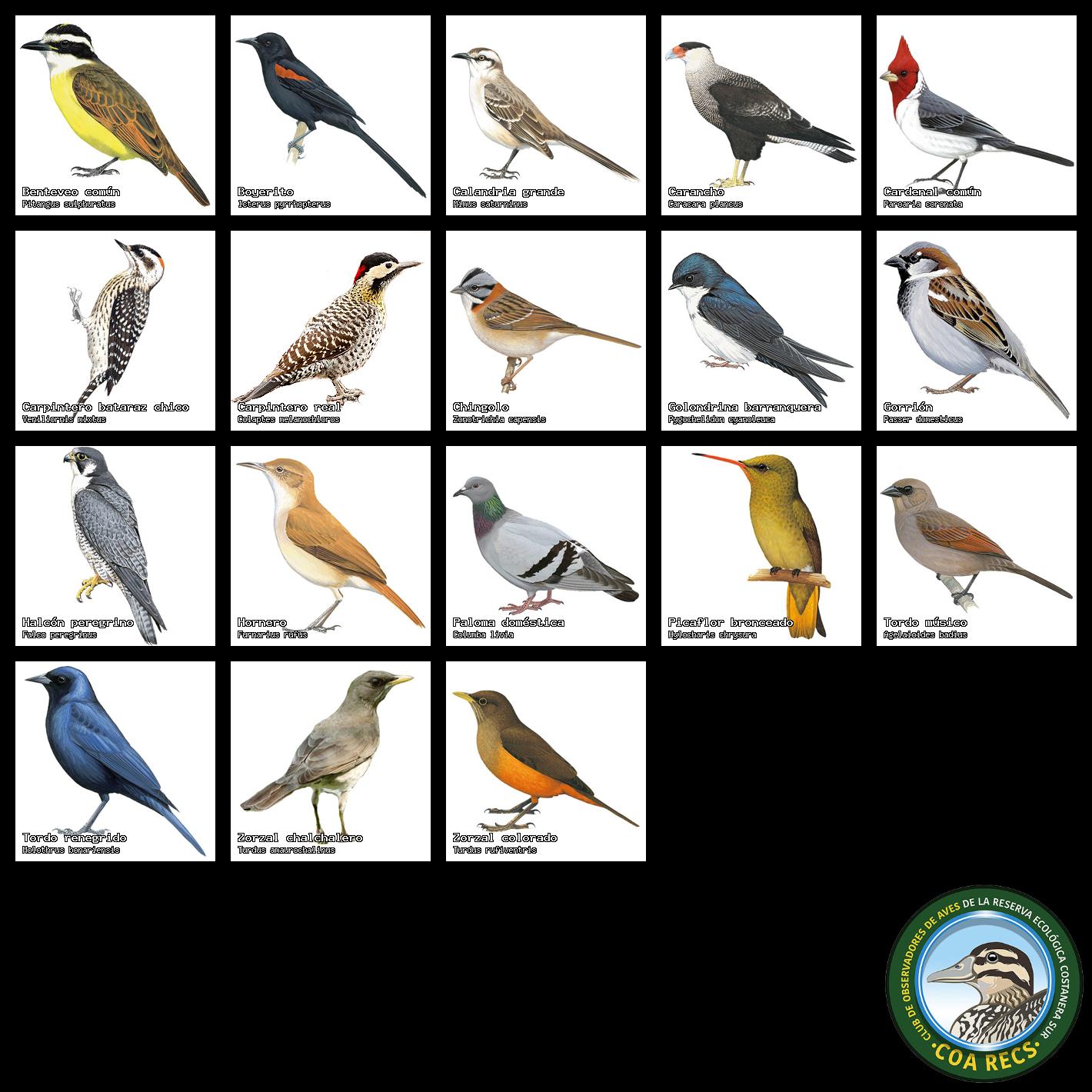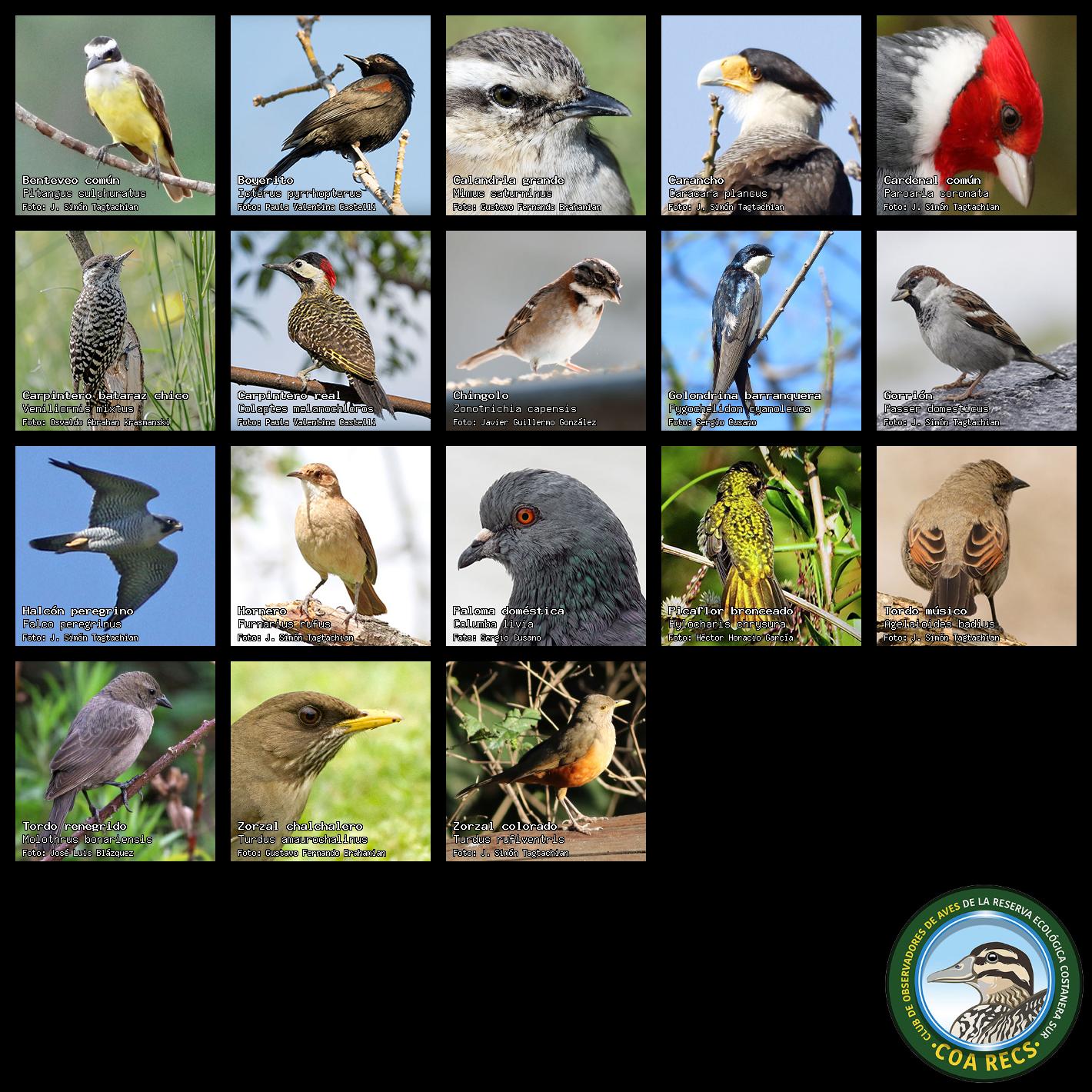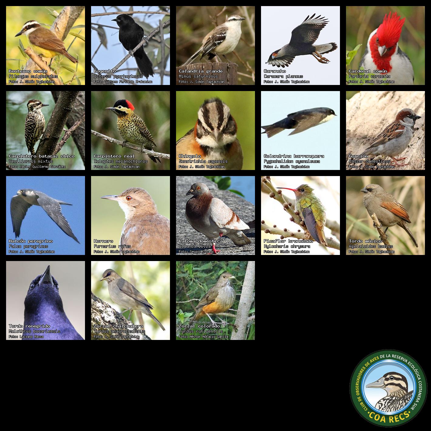 (Gavilán mixto, Carancho, Chimango, Benteveo común, Hornero, Carpintero real y Estornino pinto)