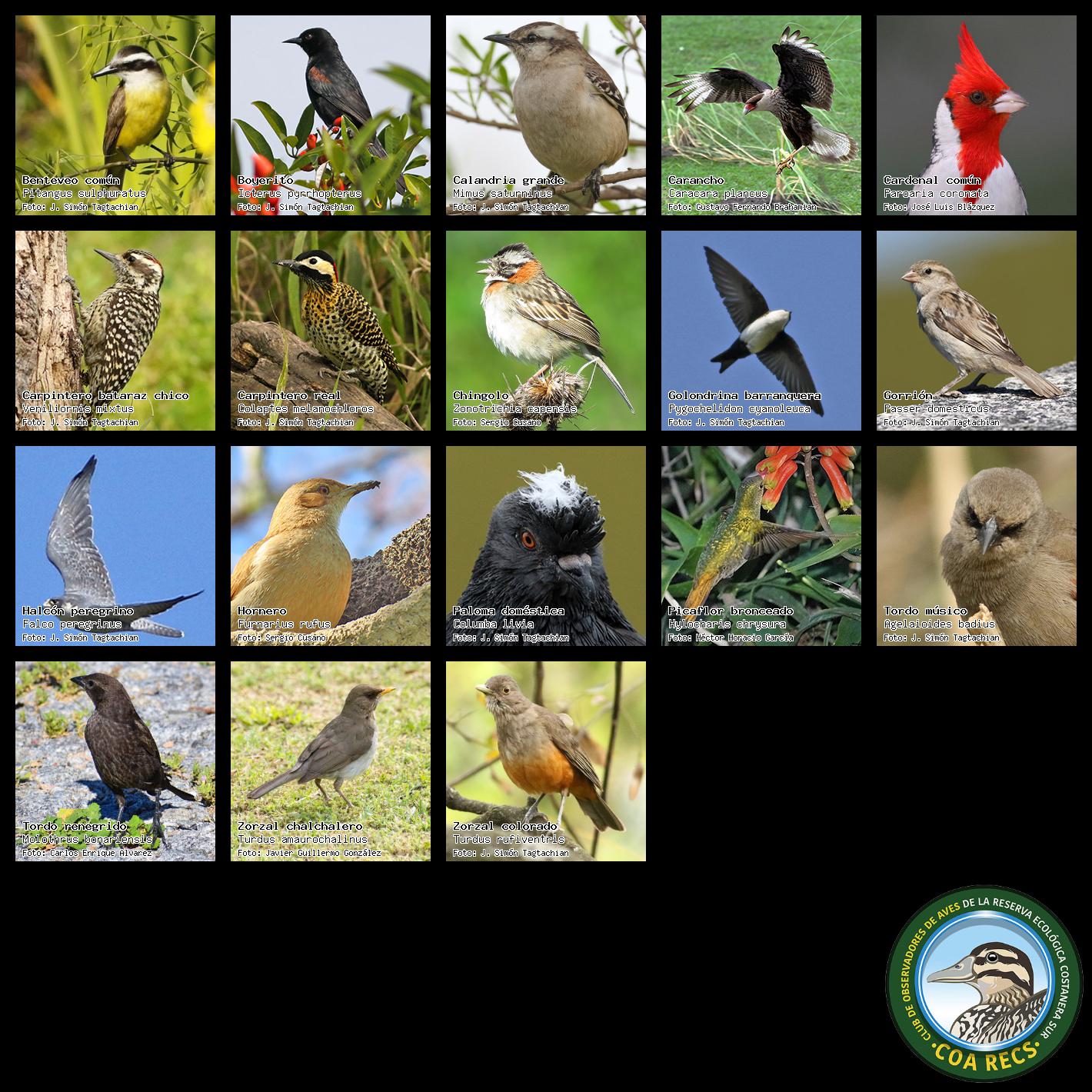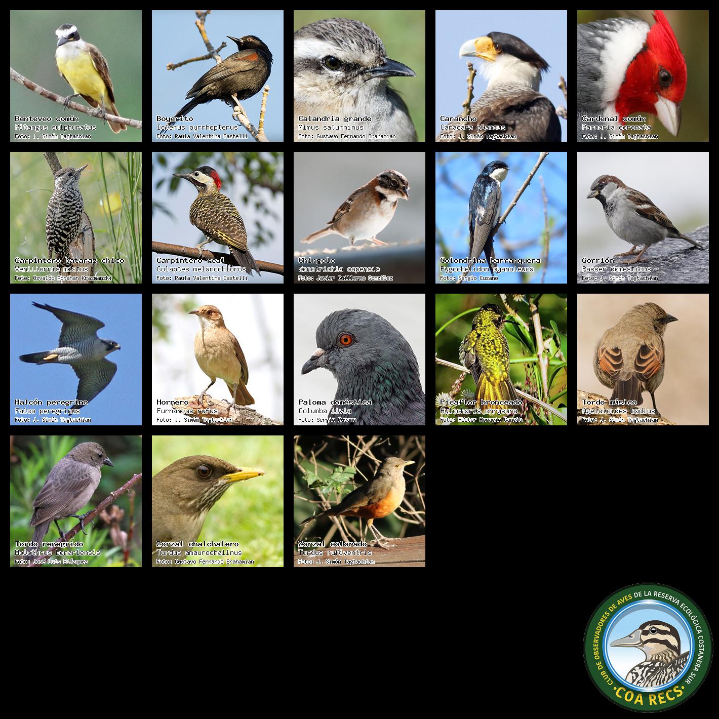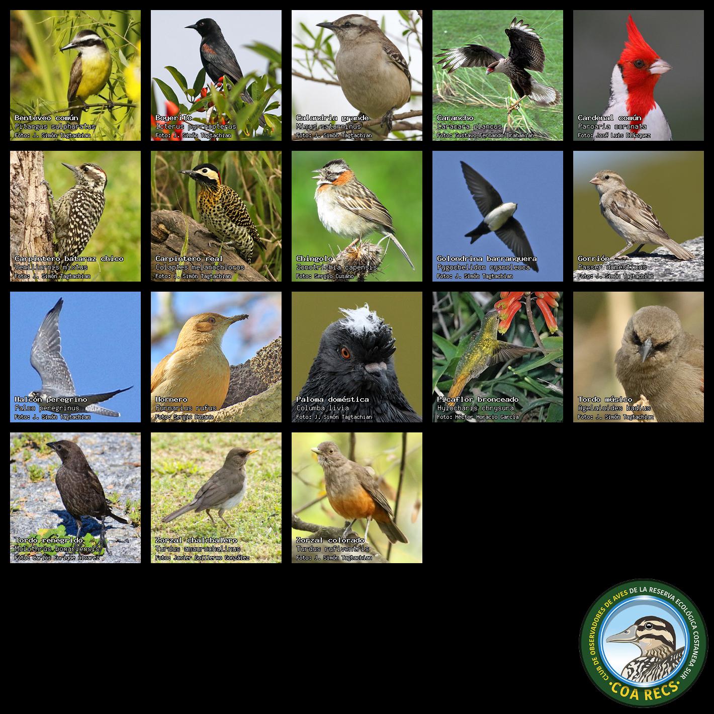 (Gavilán mixto, Carancho, Chimango, Benteveo común, Hornero, Carpintero real y Estornino pinto)