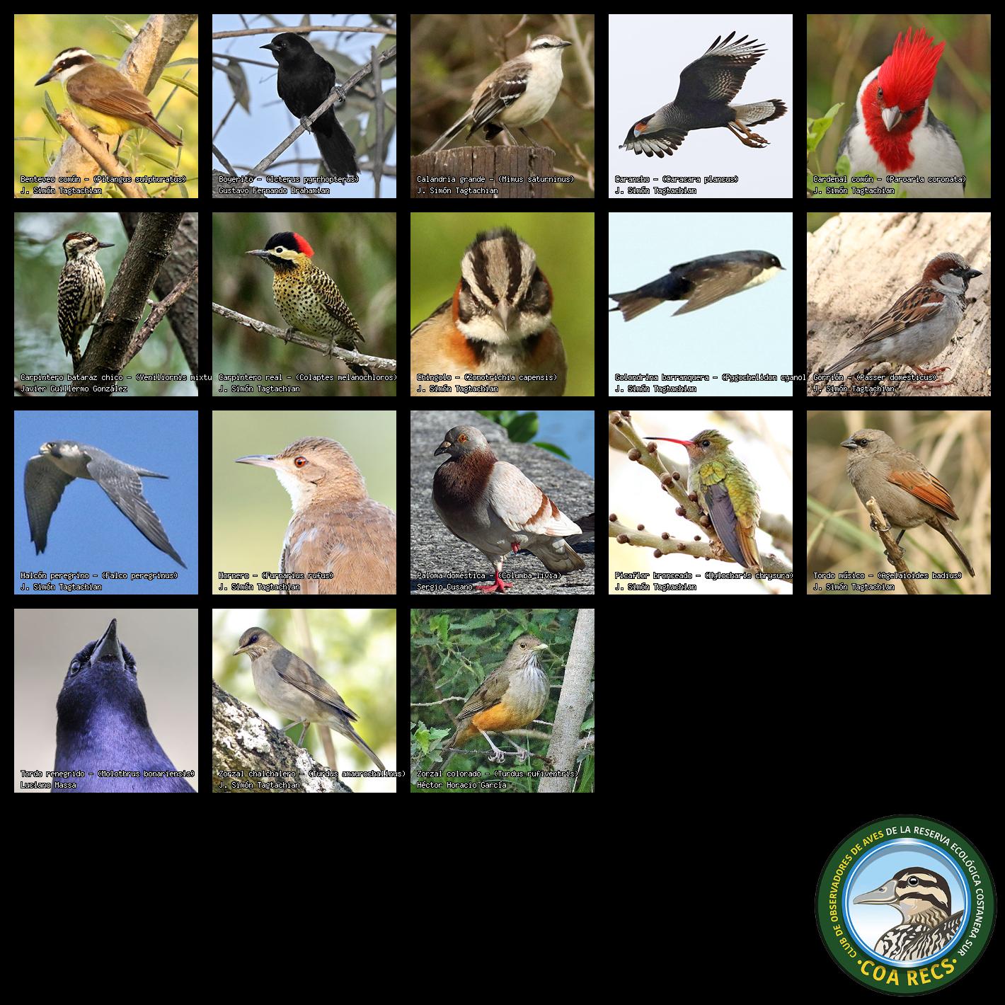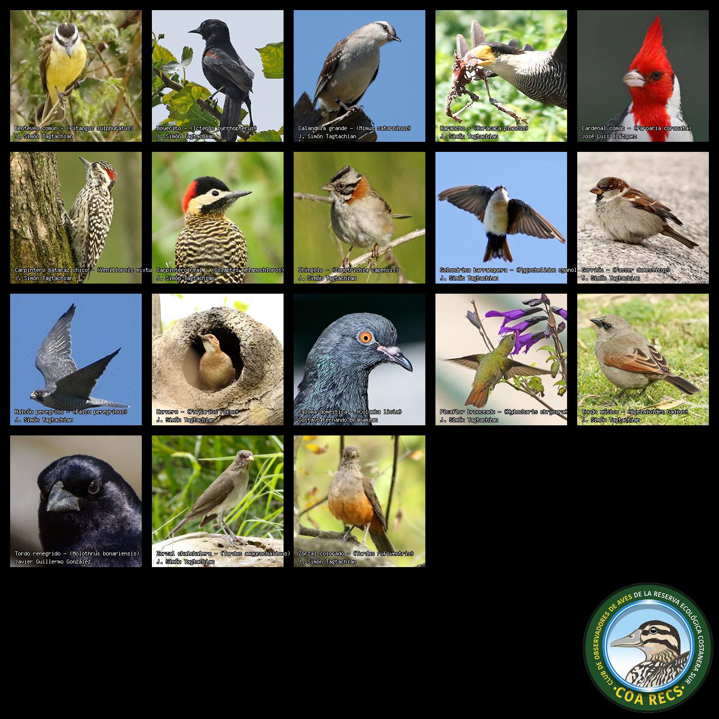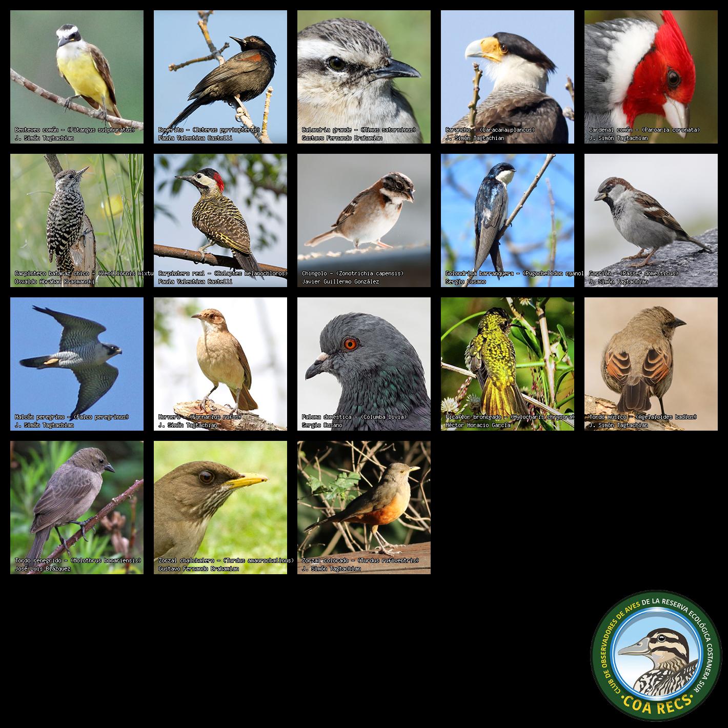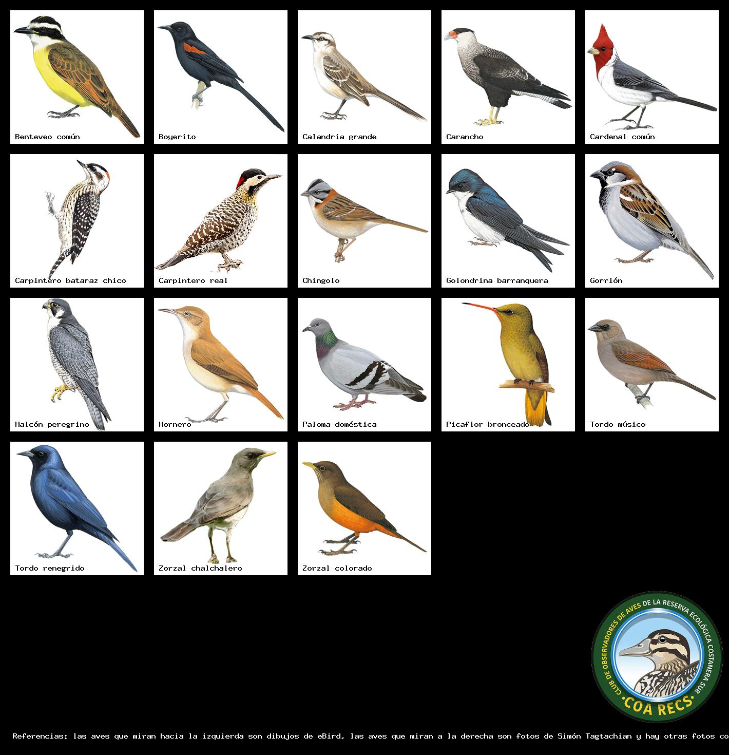 (Gavilán mixto, Carancho, Chimango, Benteveo común, Hornero, Carpintero real y Estornino pinto)