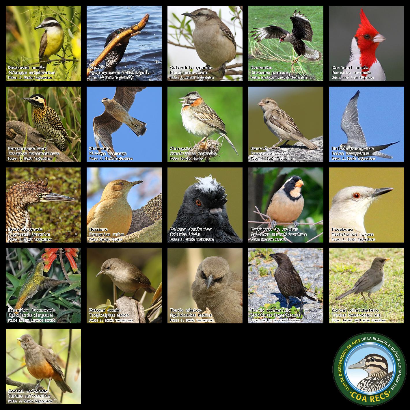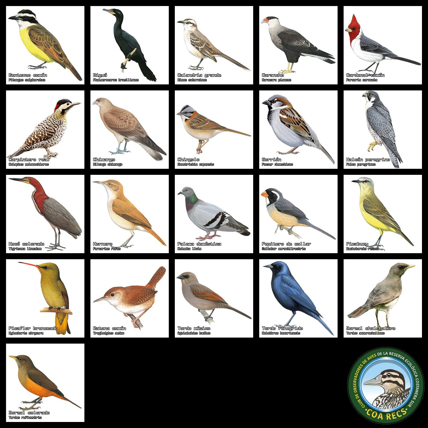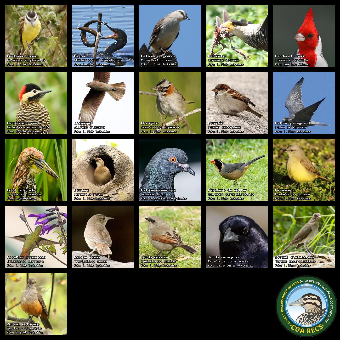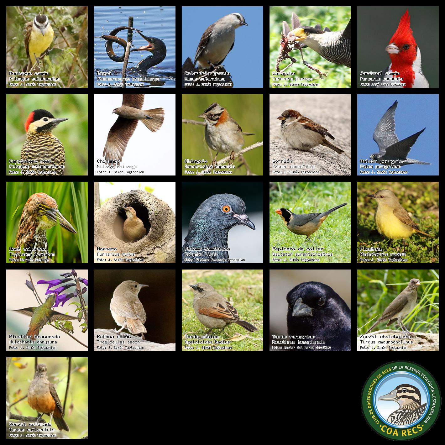 (Gavilán mixto, Carancho, Chimango, Benteveo común, Hornero, Carpintero real y Estornino pinto)