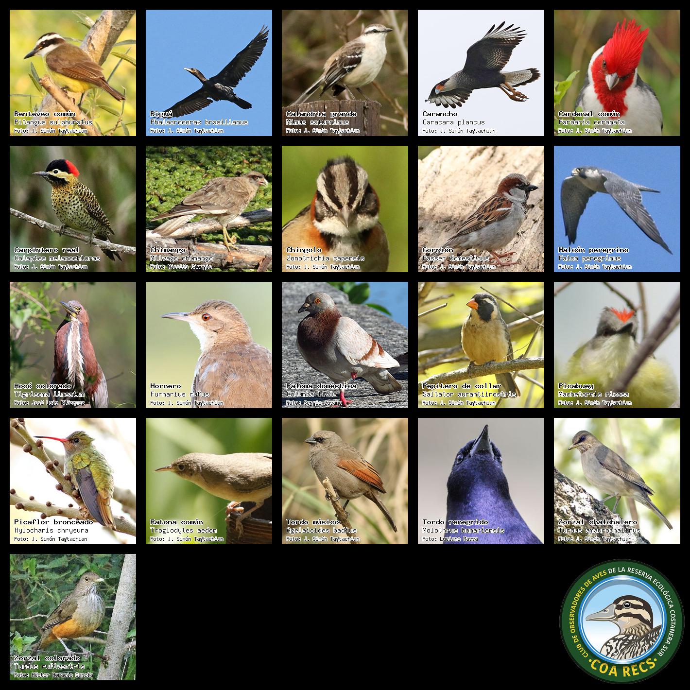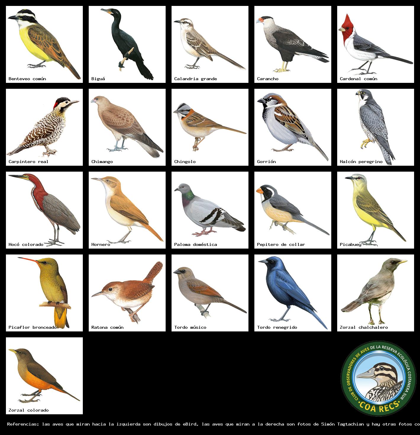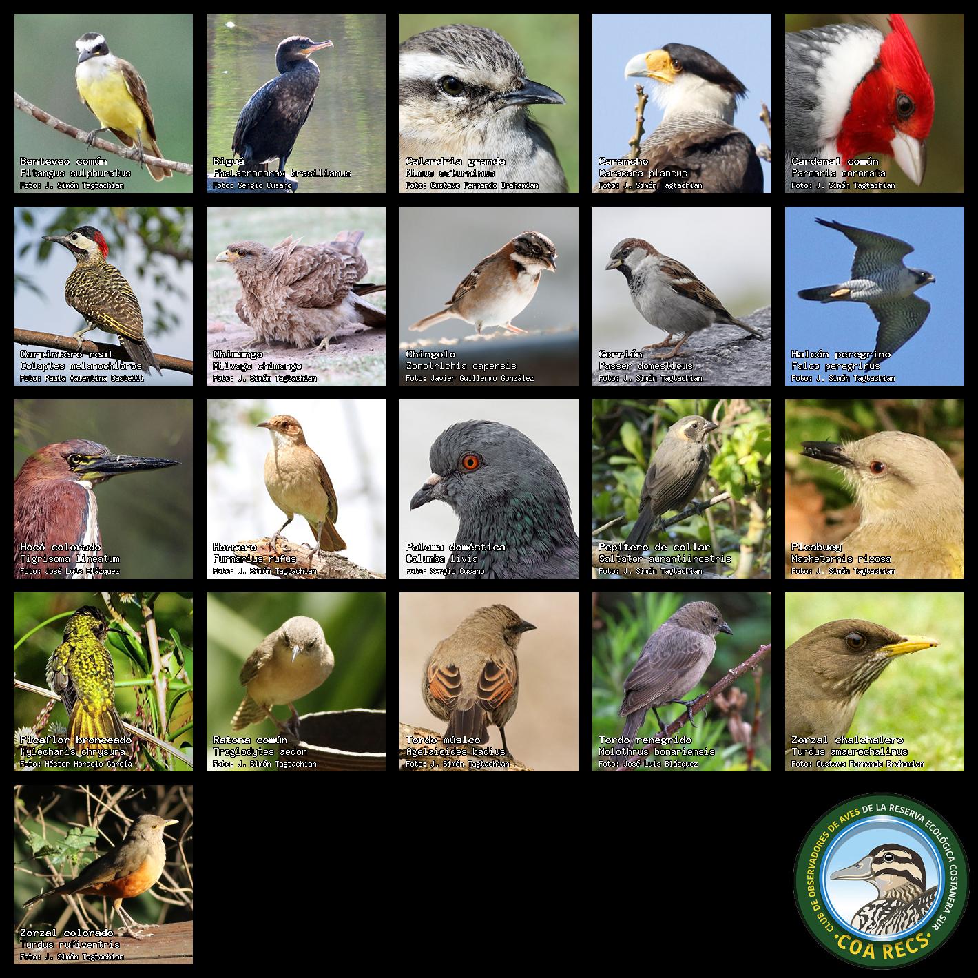 (Gavilán mixto, Carancho, Chimango, Benteveo común, Hornero, Carpintero real y Estornino pinto)