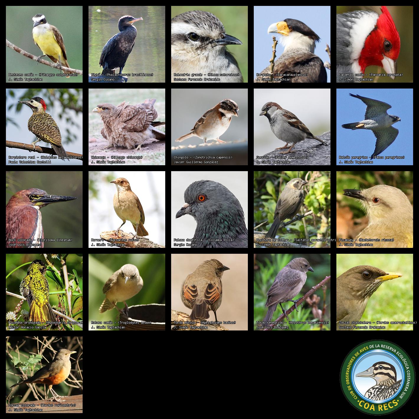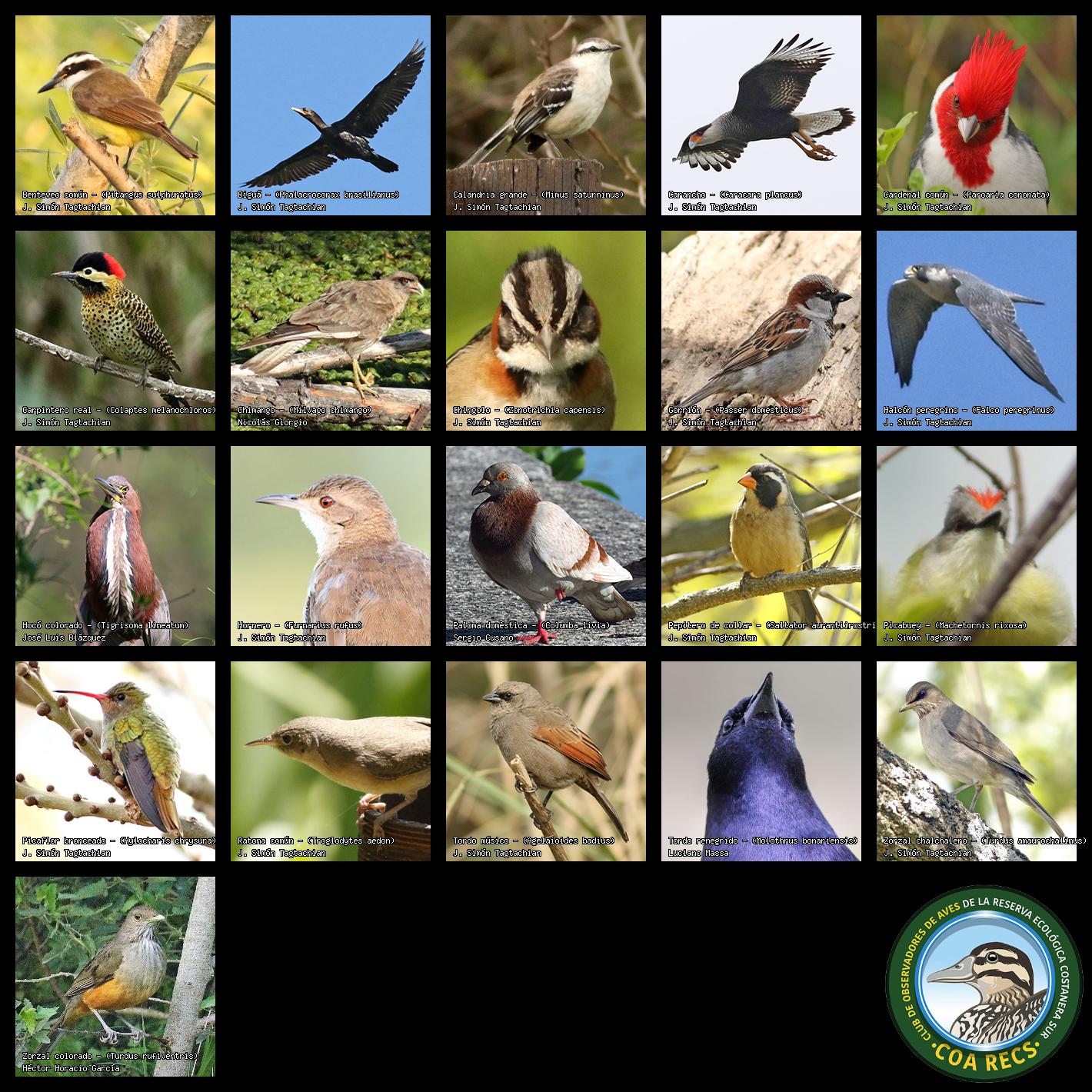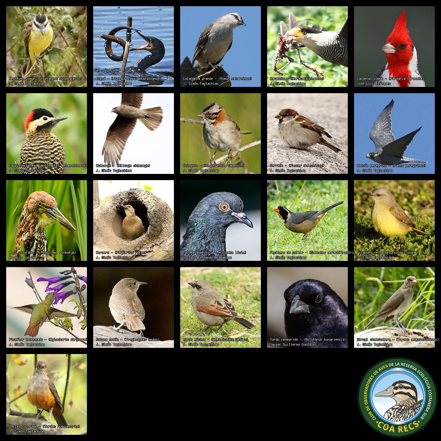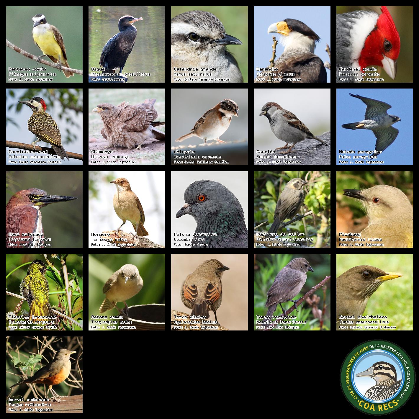 (Gavilán mixto, Carancho, Chimango, Benteveo común, Hornero, Carpintero real y Estornino pinto)