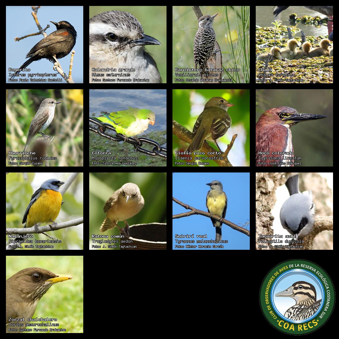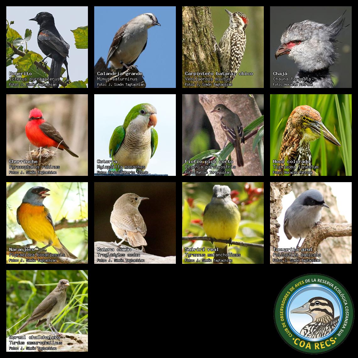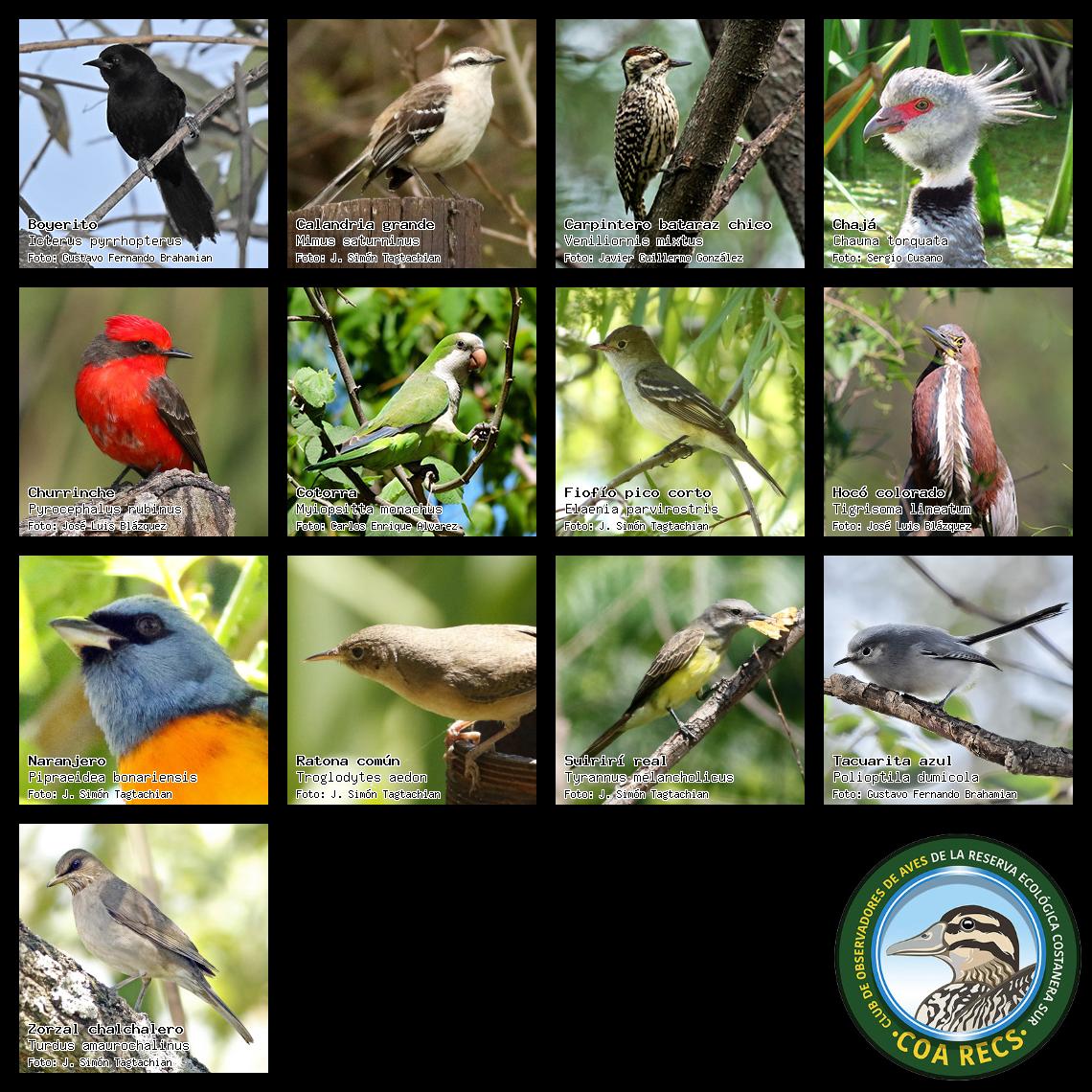 (Gavilán mixto, Carancho, Chimango, Benteveo común, Hornero, Carpintero real y Estornino pinto)