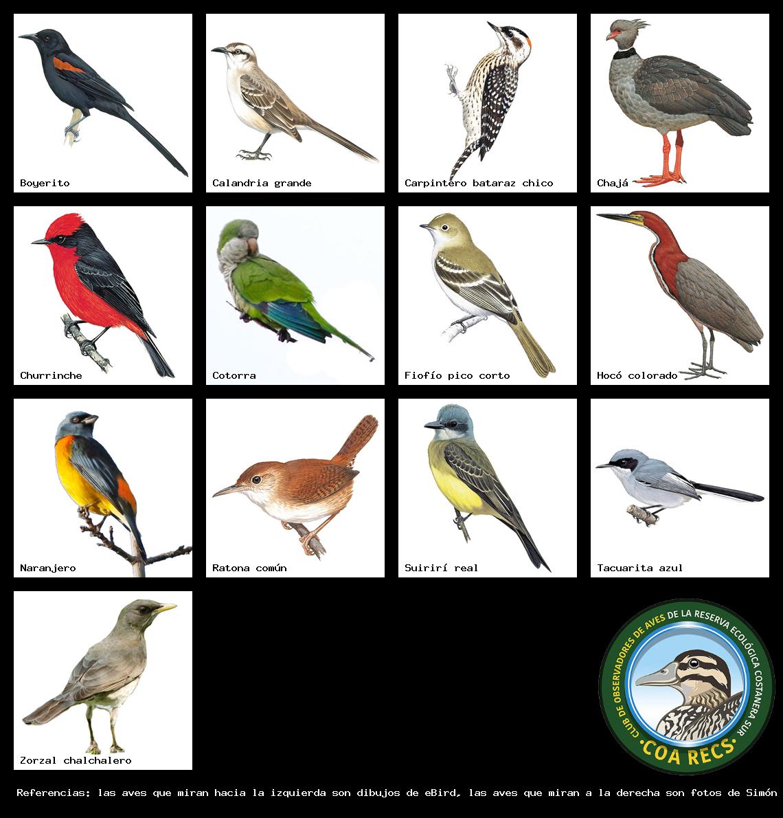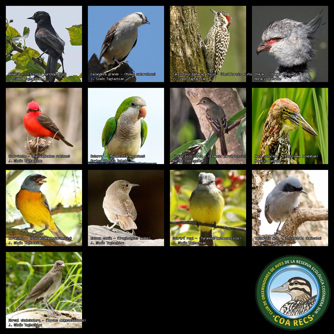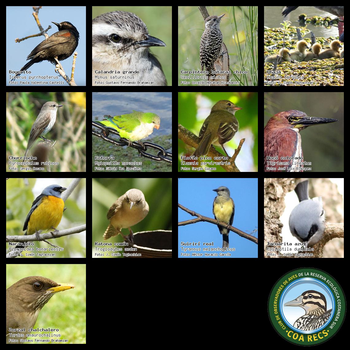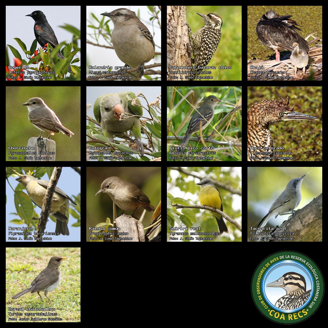 (Gavilán mixto, Carancho, Chimango, Benteveo común, Hornero, Carpintero real y Estornino pinto)