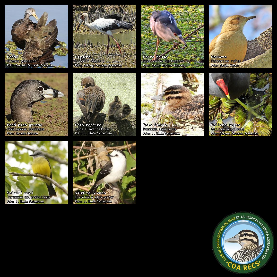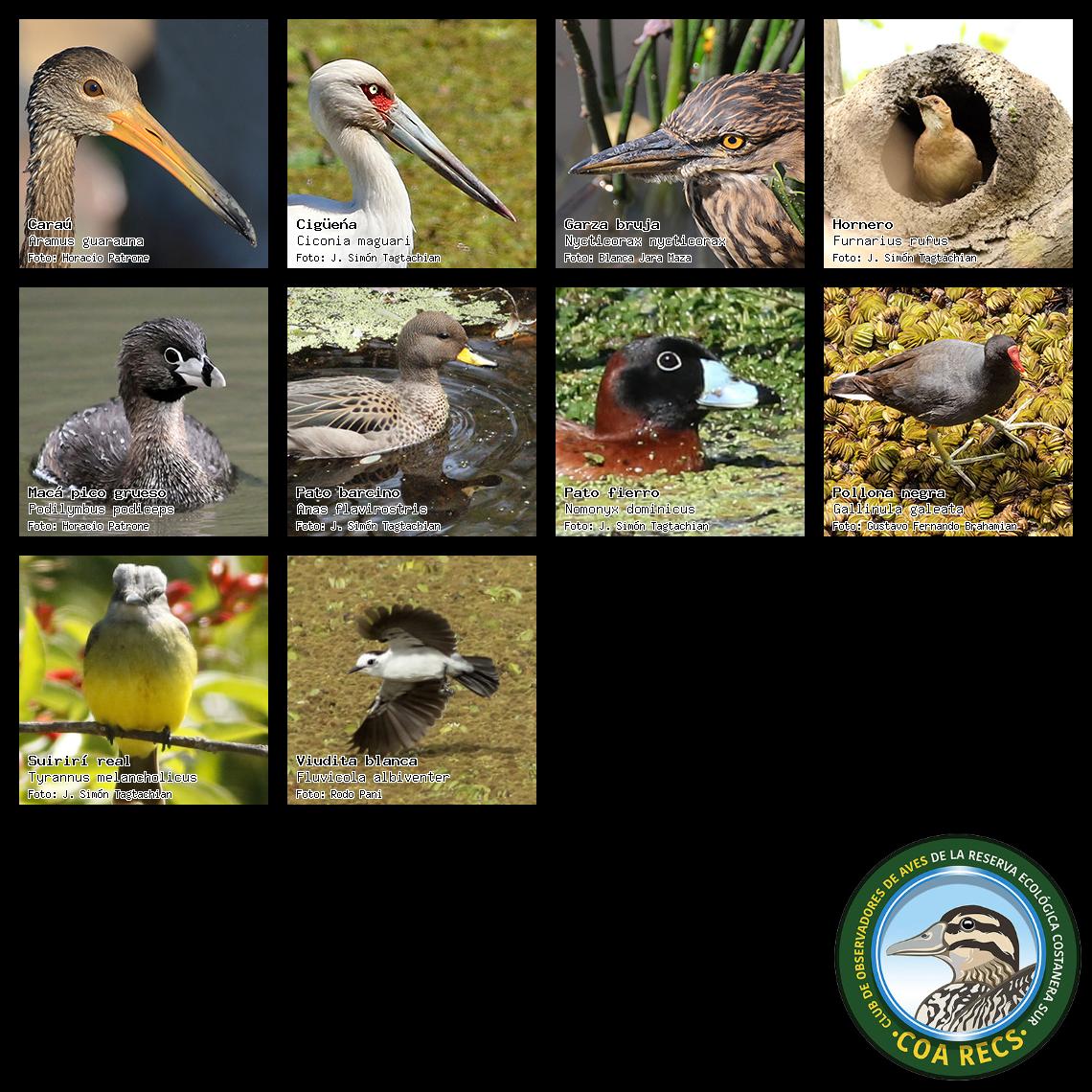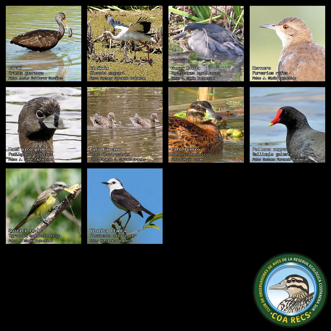 (Gavilán mixto, Carancho, Chimango, Benteveo común, Hornero, Carpintero real y Estornino pinto)