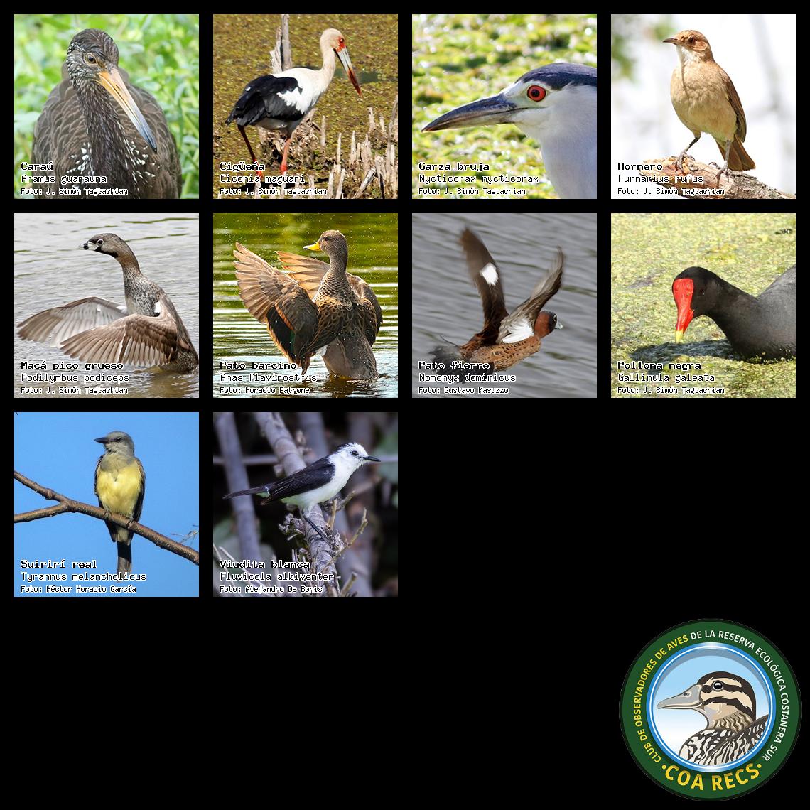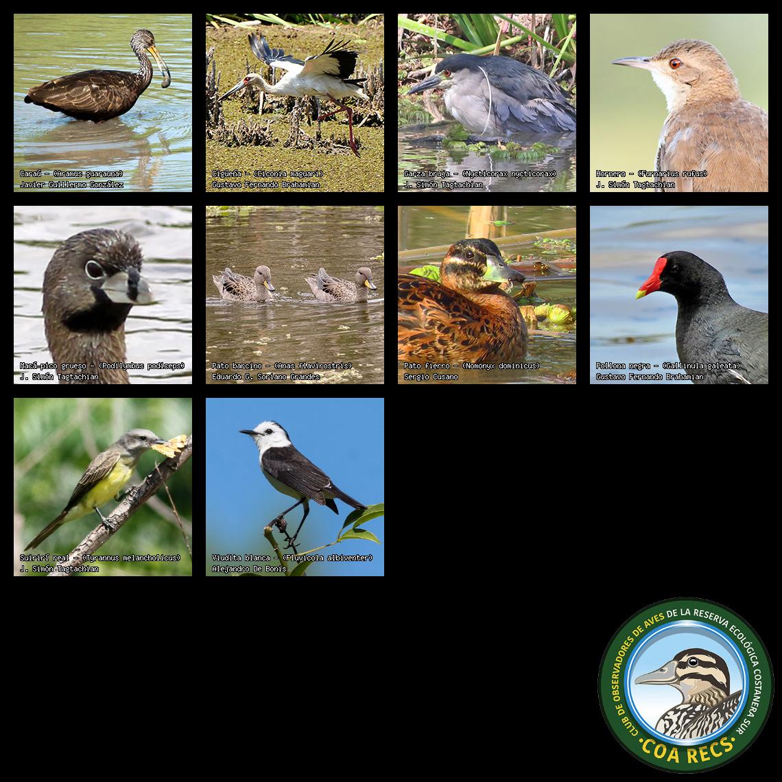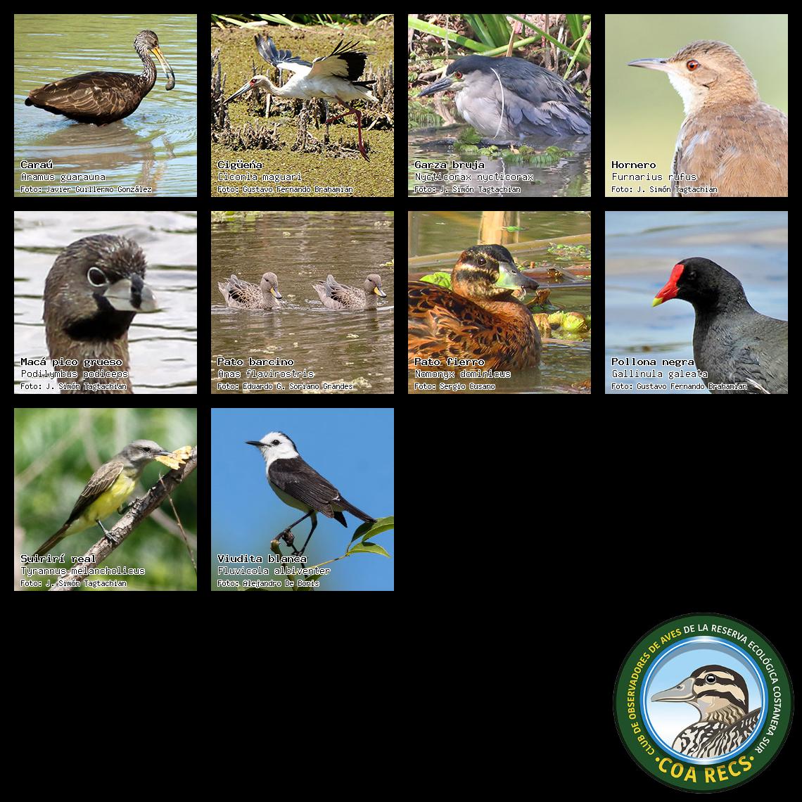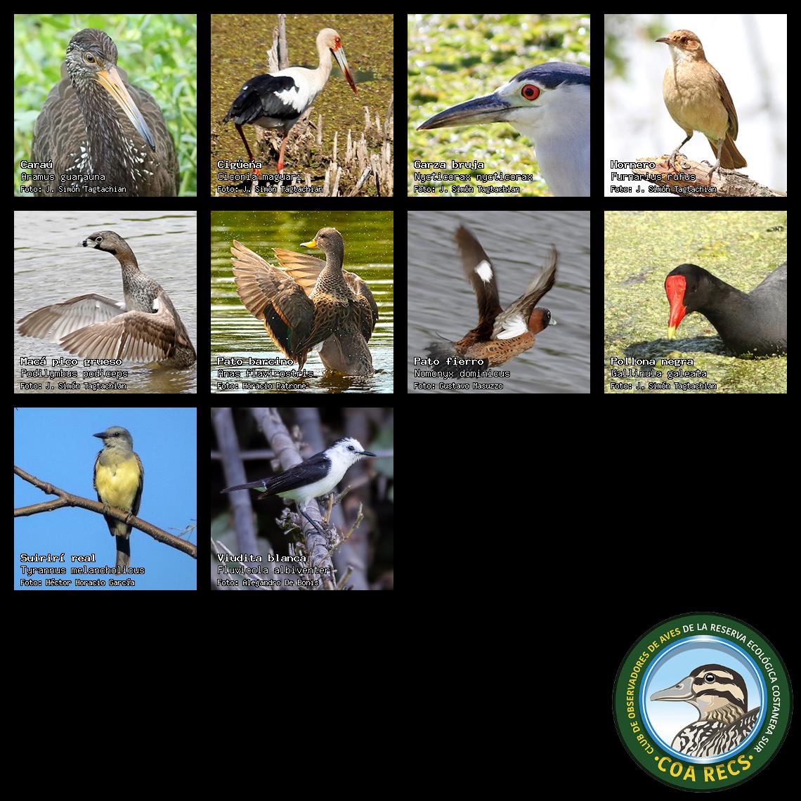 (Gavilán mixto, Carancho, Chimango, Benteveo común, Hornero, Carpintero real y Estornino pinto)