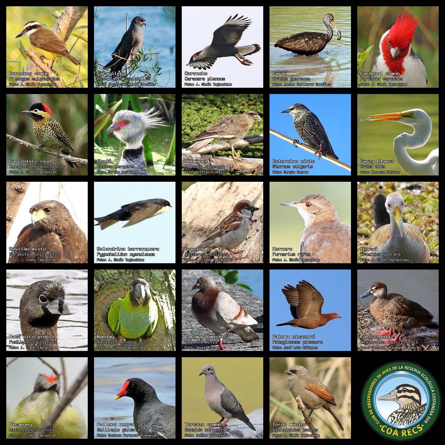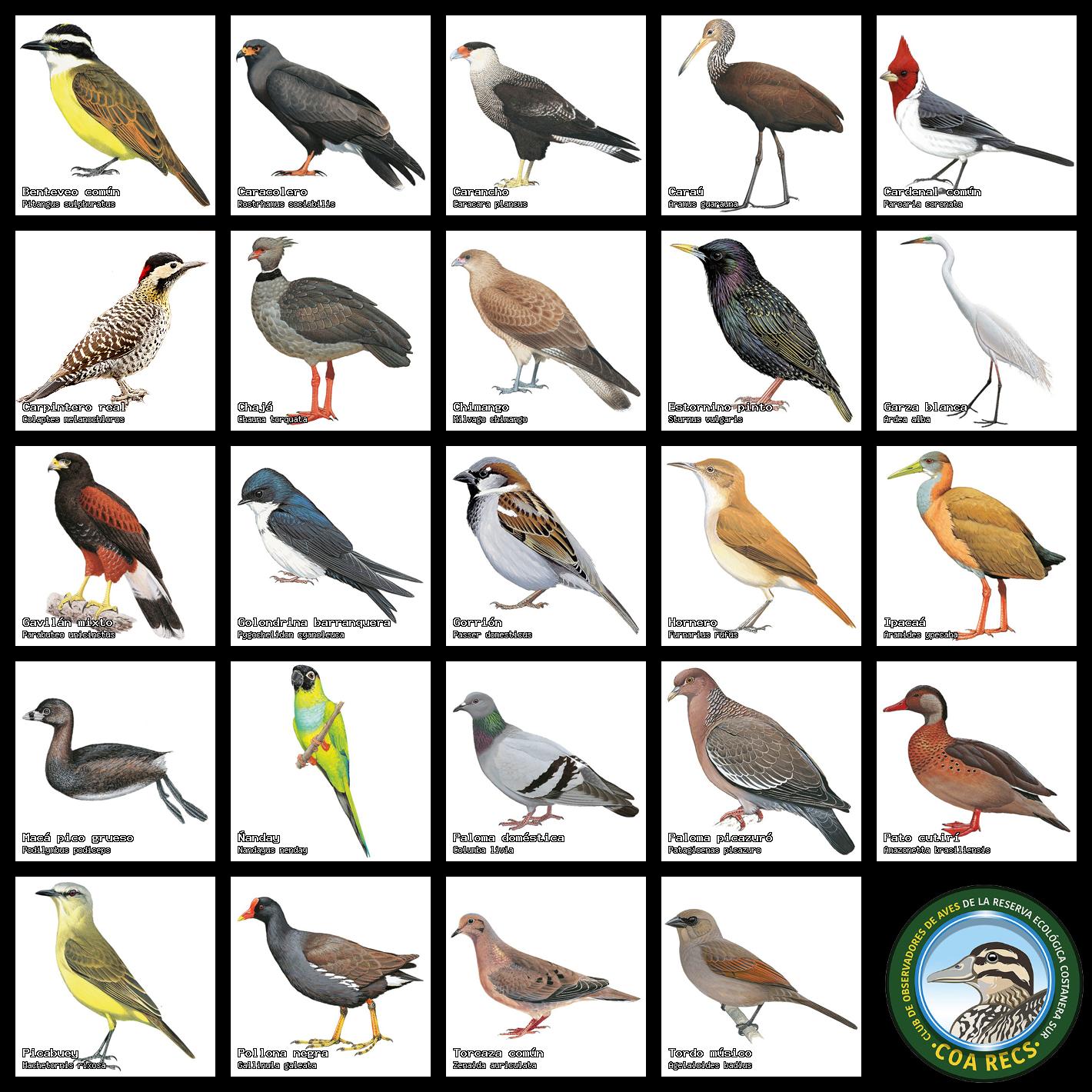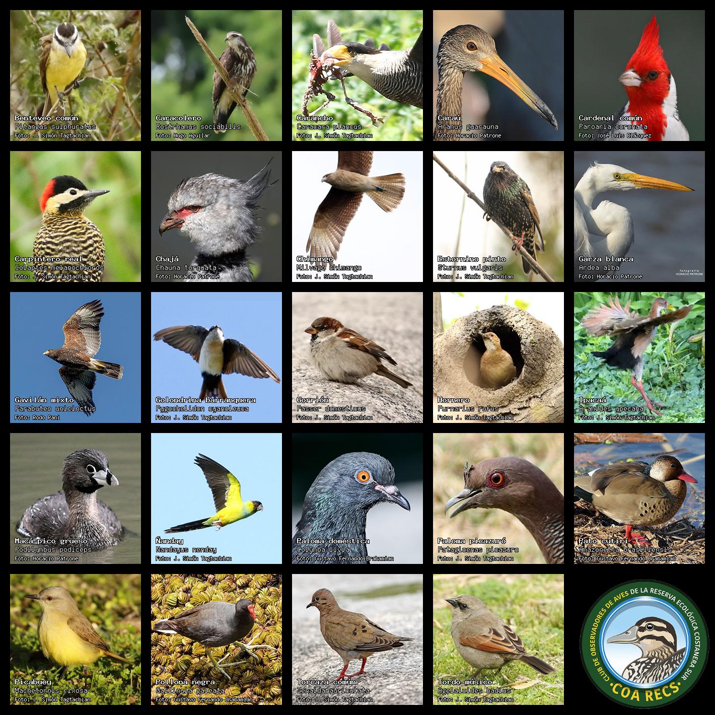 (Gavilán mixto, Carancho, Chimango, Benteveo común, Hornero, Carpintero real y Estornino pinto)