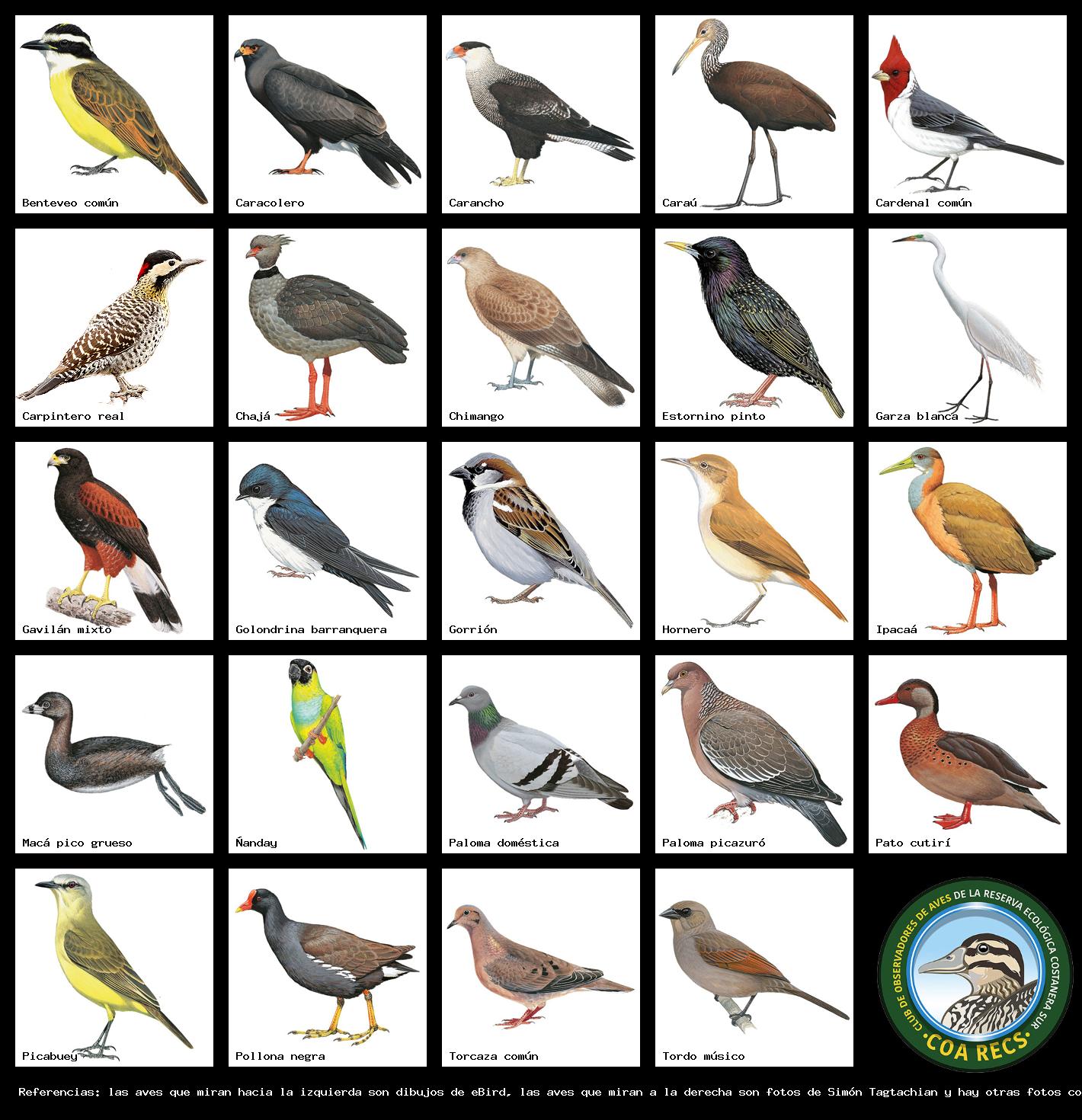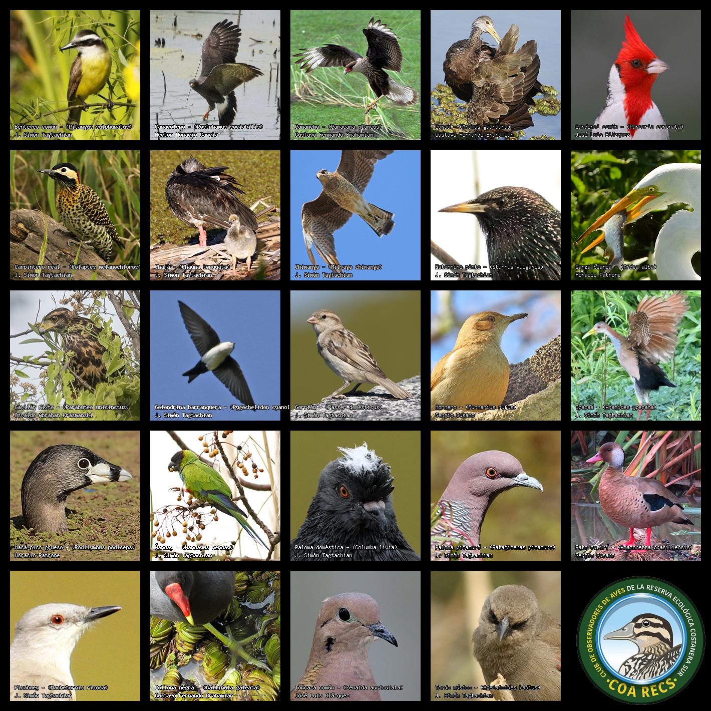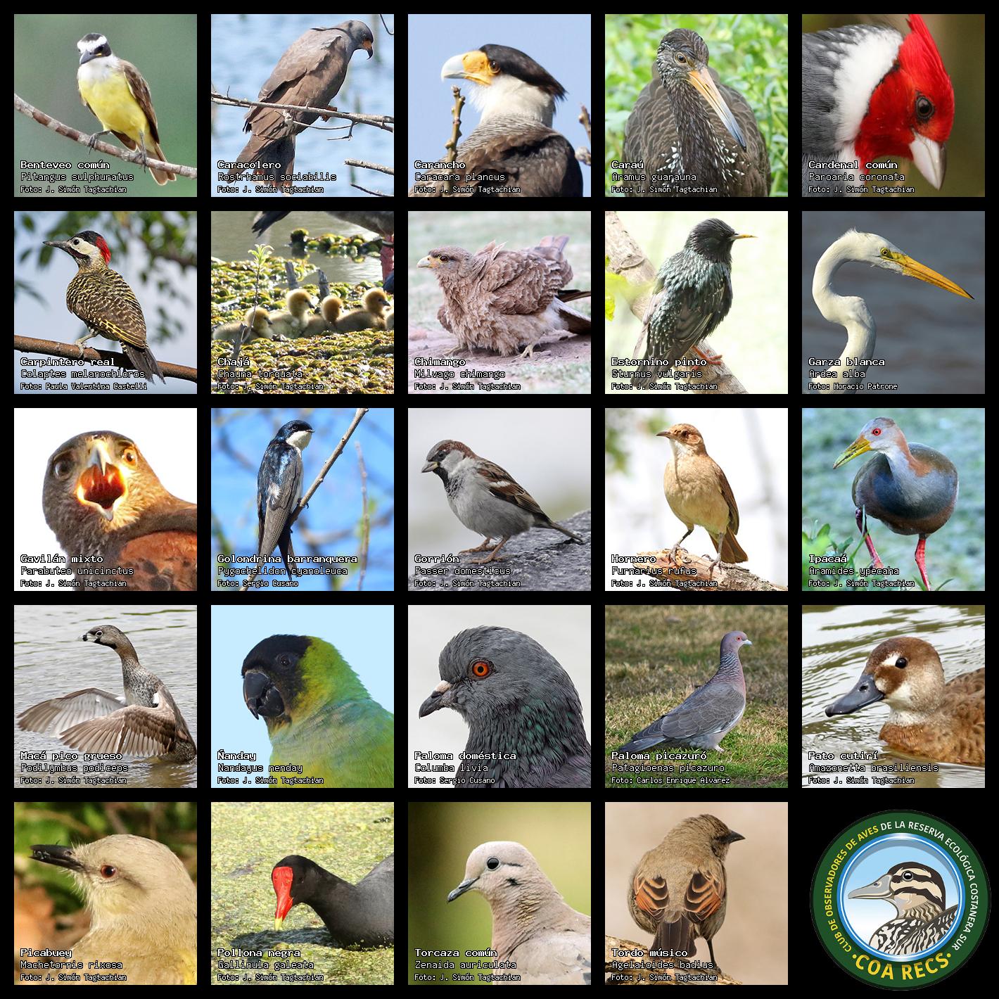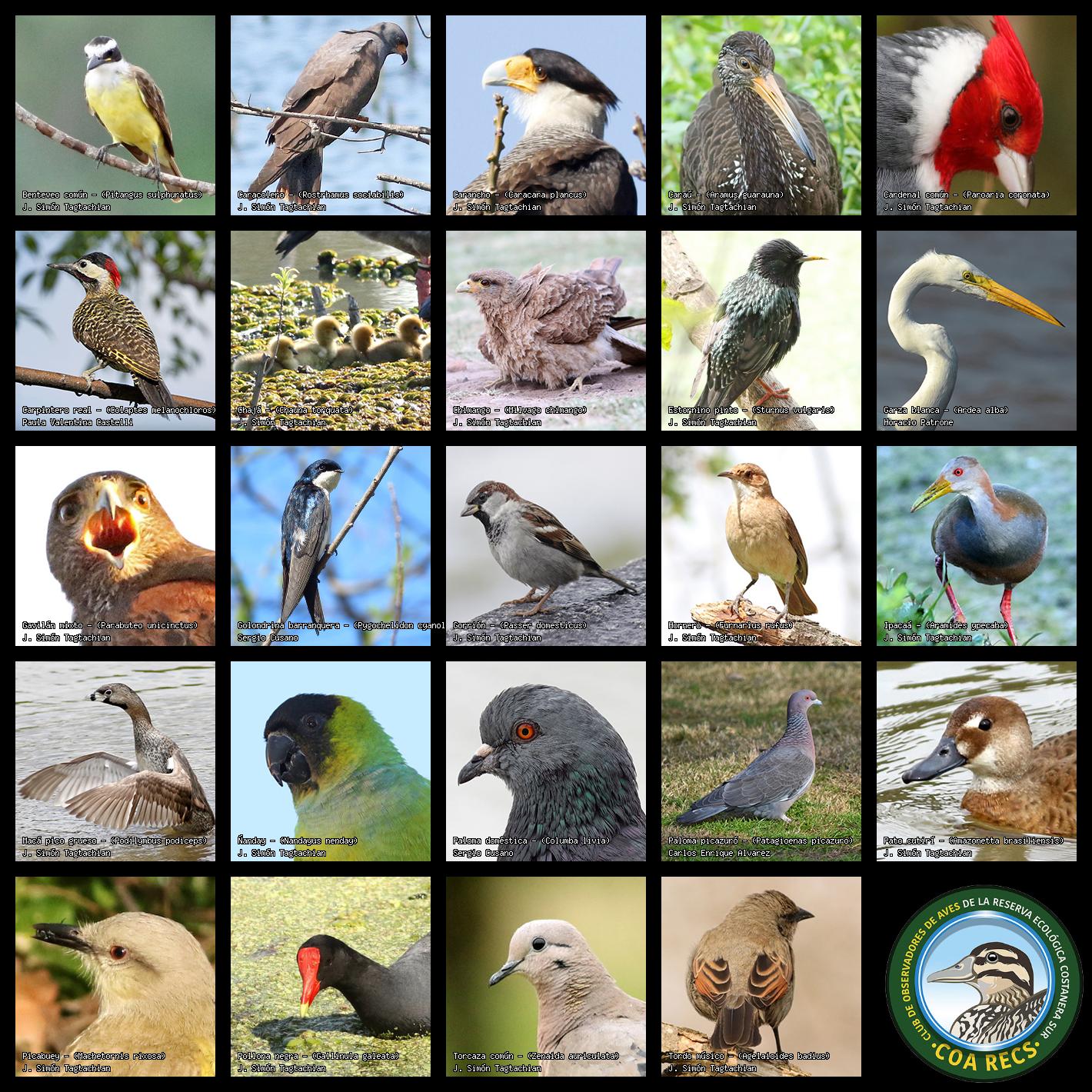 (Gavilán mixto, Carancho, Chimango, Benteveo común, Hornero, Carpintero real y Estornino pinto)