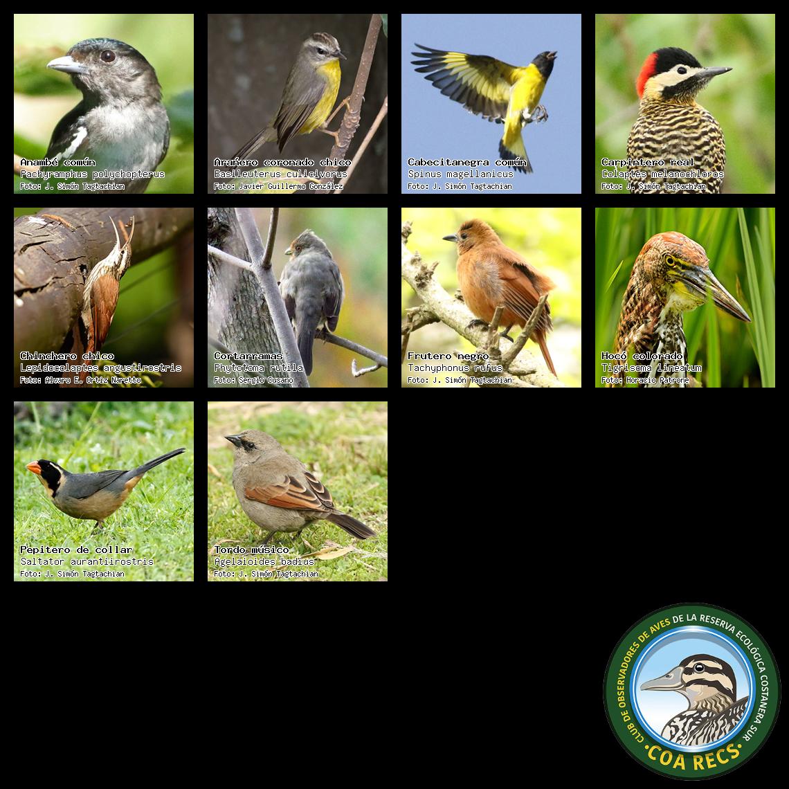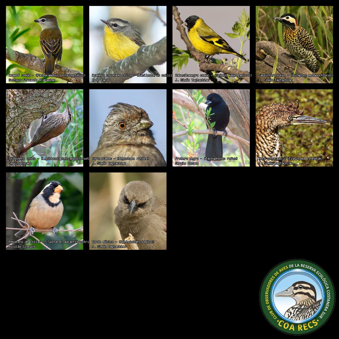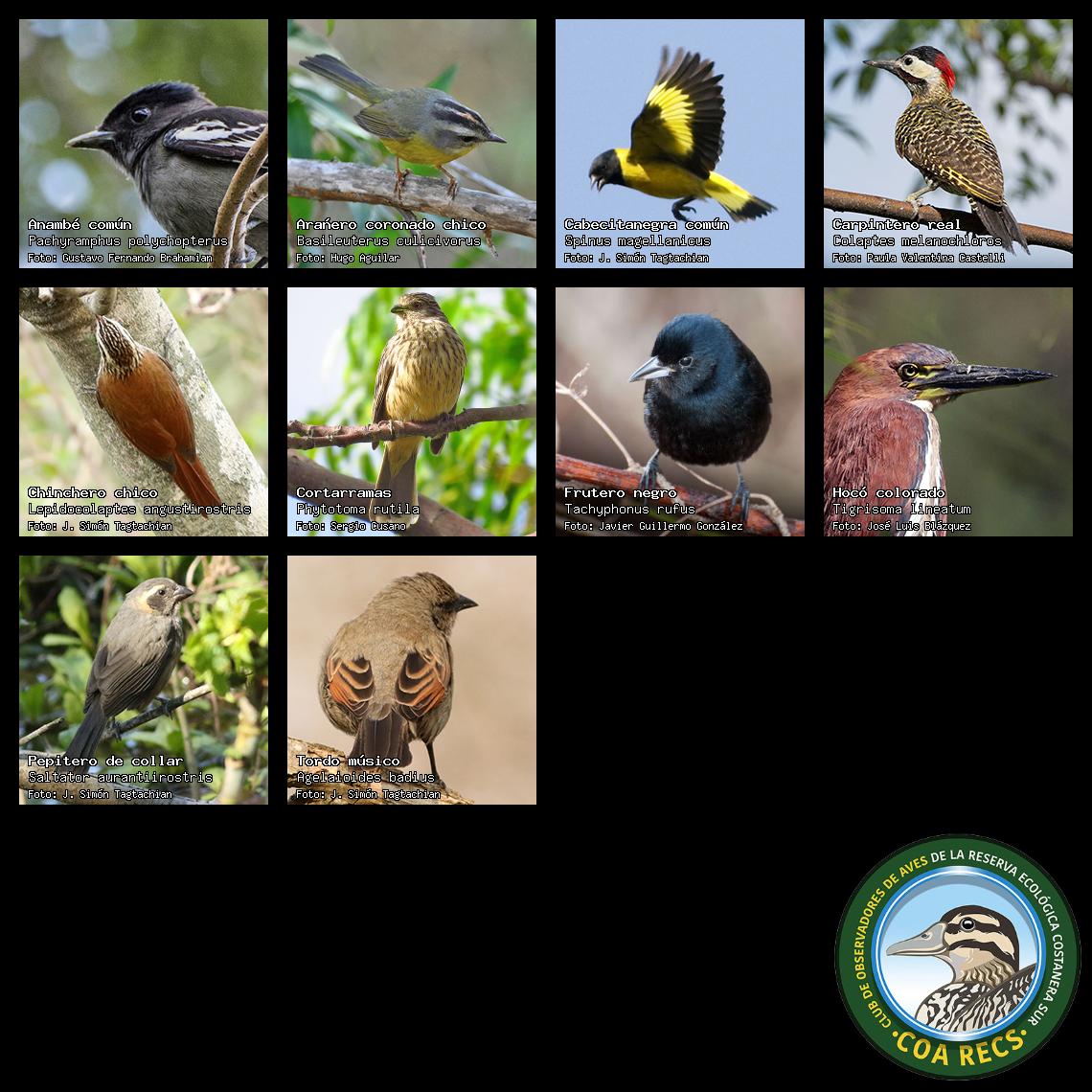 (Gavilán mixto, Carancho, Chimango, Benteveo común, Hornero, Carpintero real y Estornino pinto)