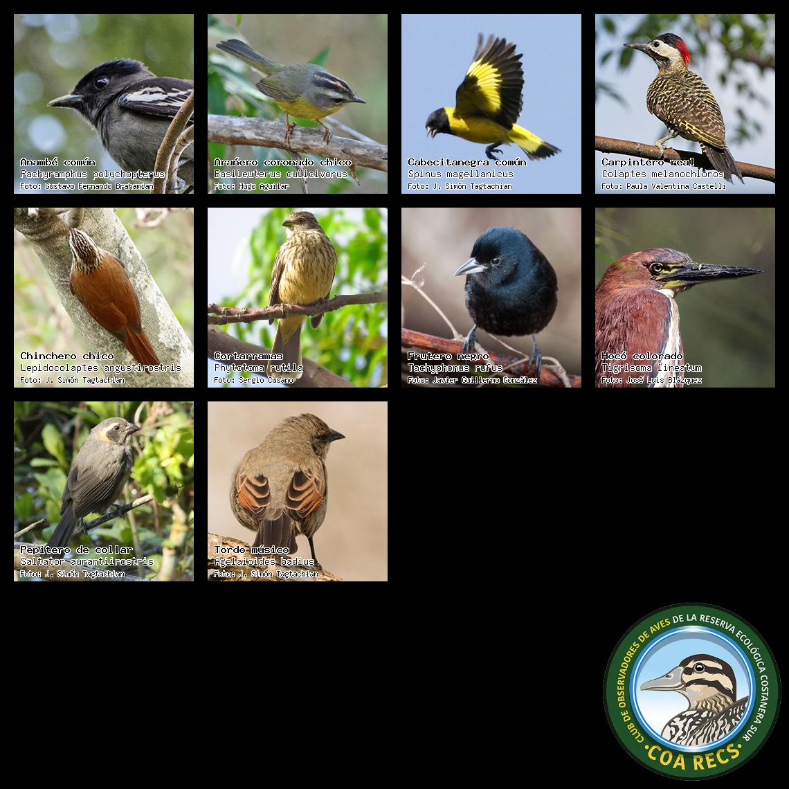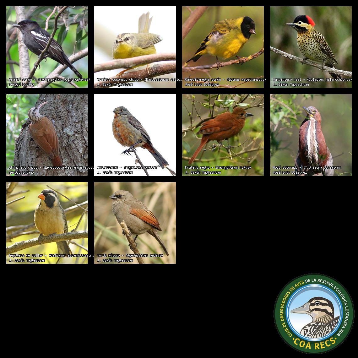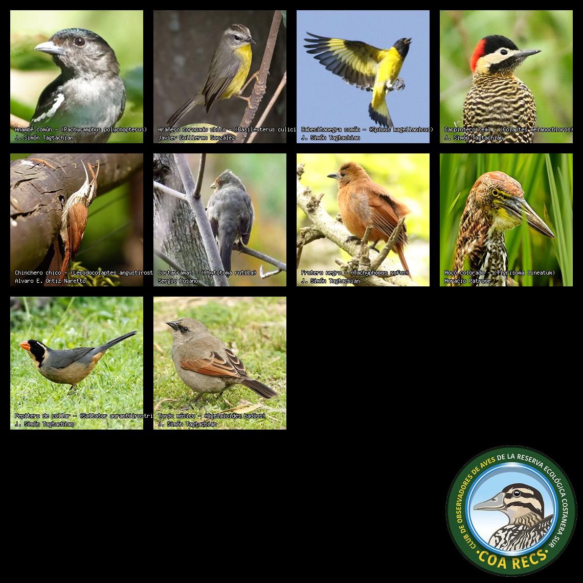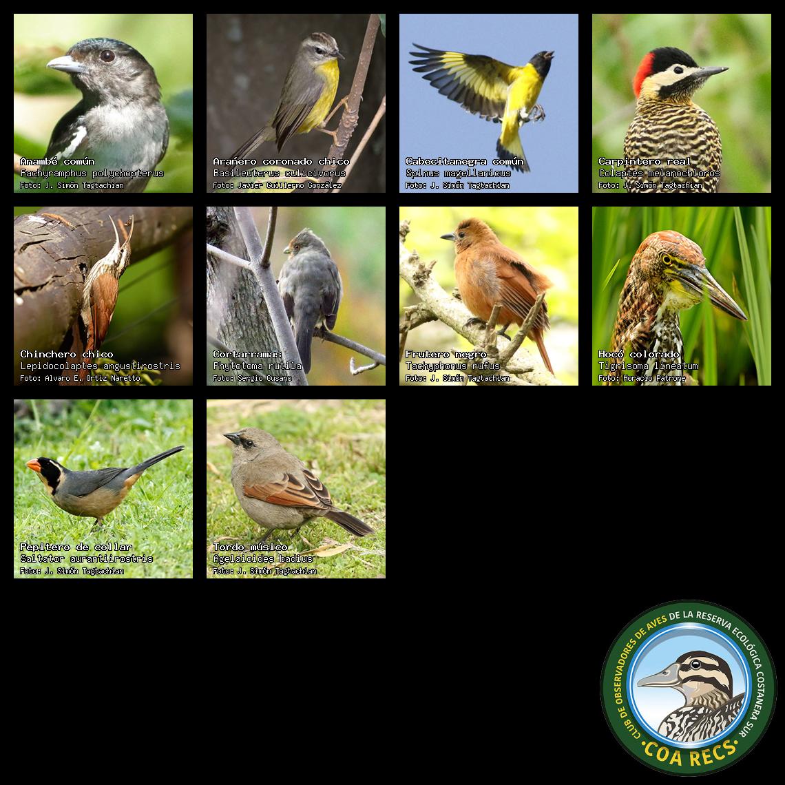 (Gavilán mixto, Carancho, Chimango, Benteveo común, Hornero, Carpintero real y Estornino pinto)
