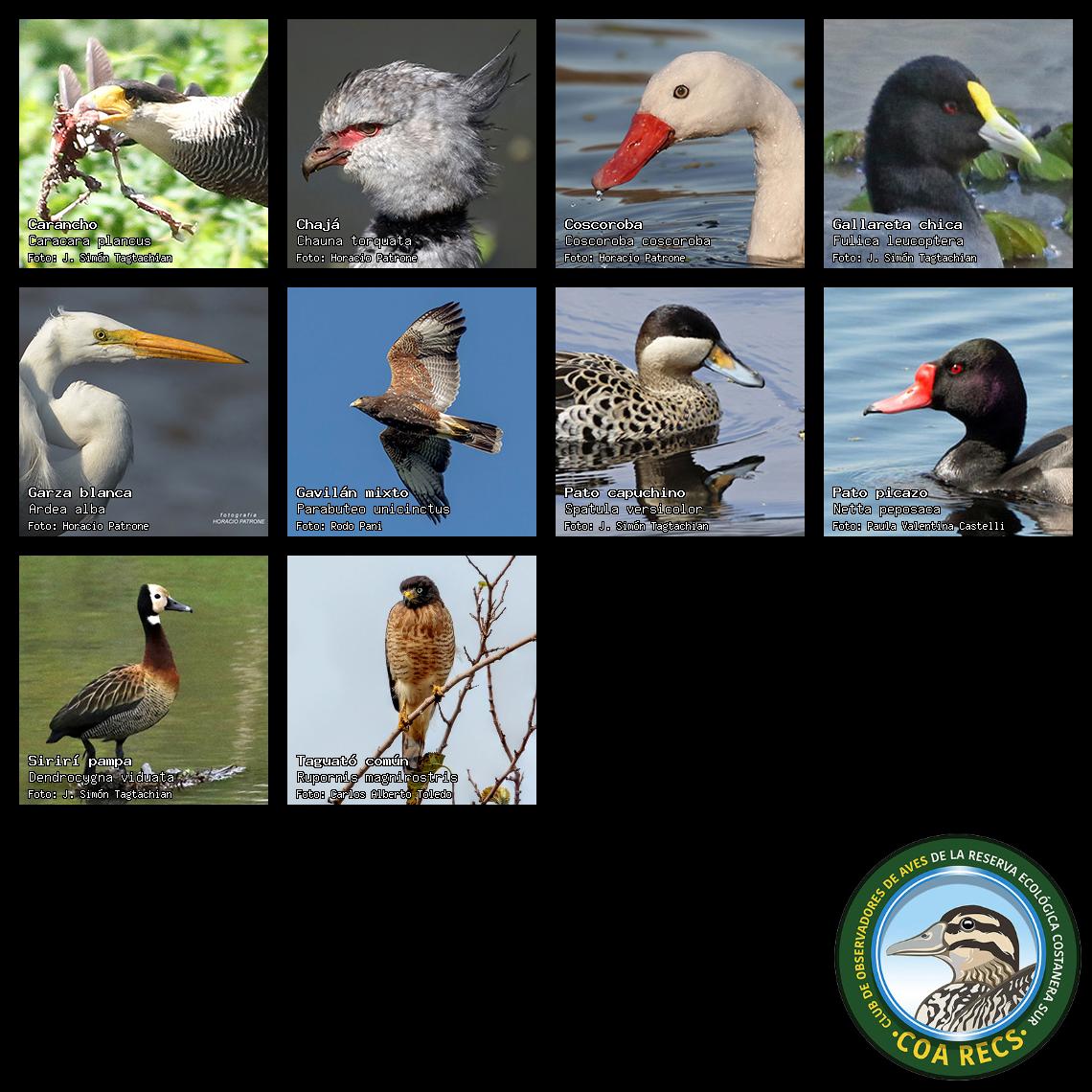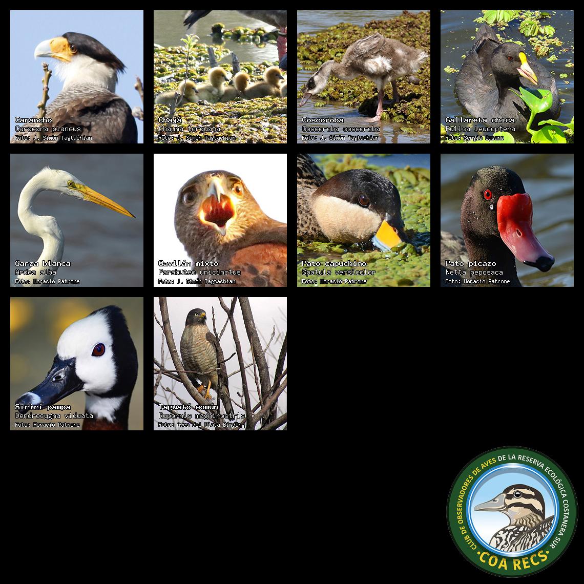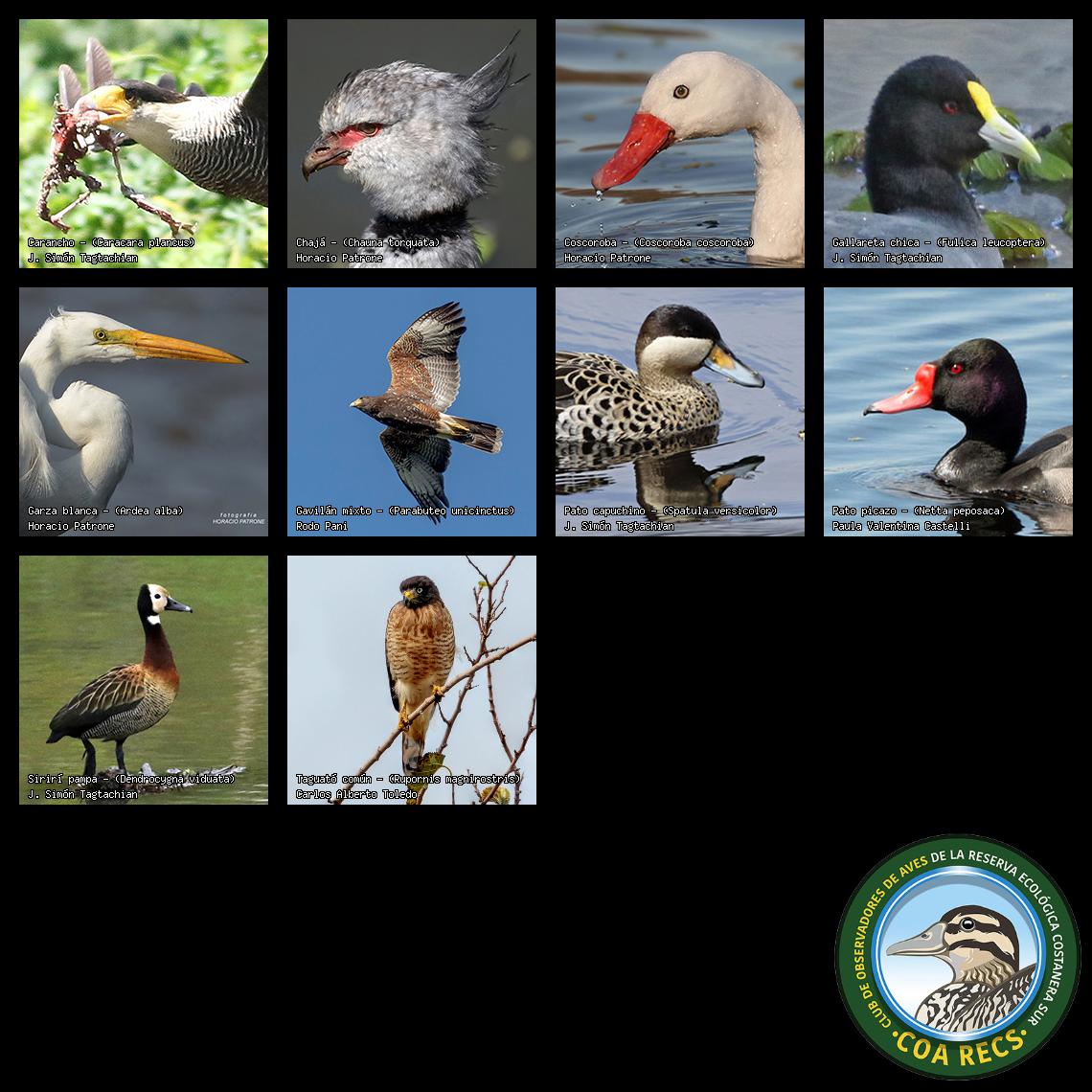 (Gavilán mixto, Carancho, Chimango, Benteveo común, Hornero, Carpintero real y Estornino pinto)