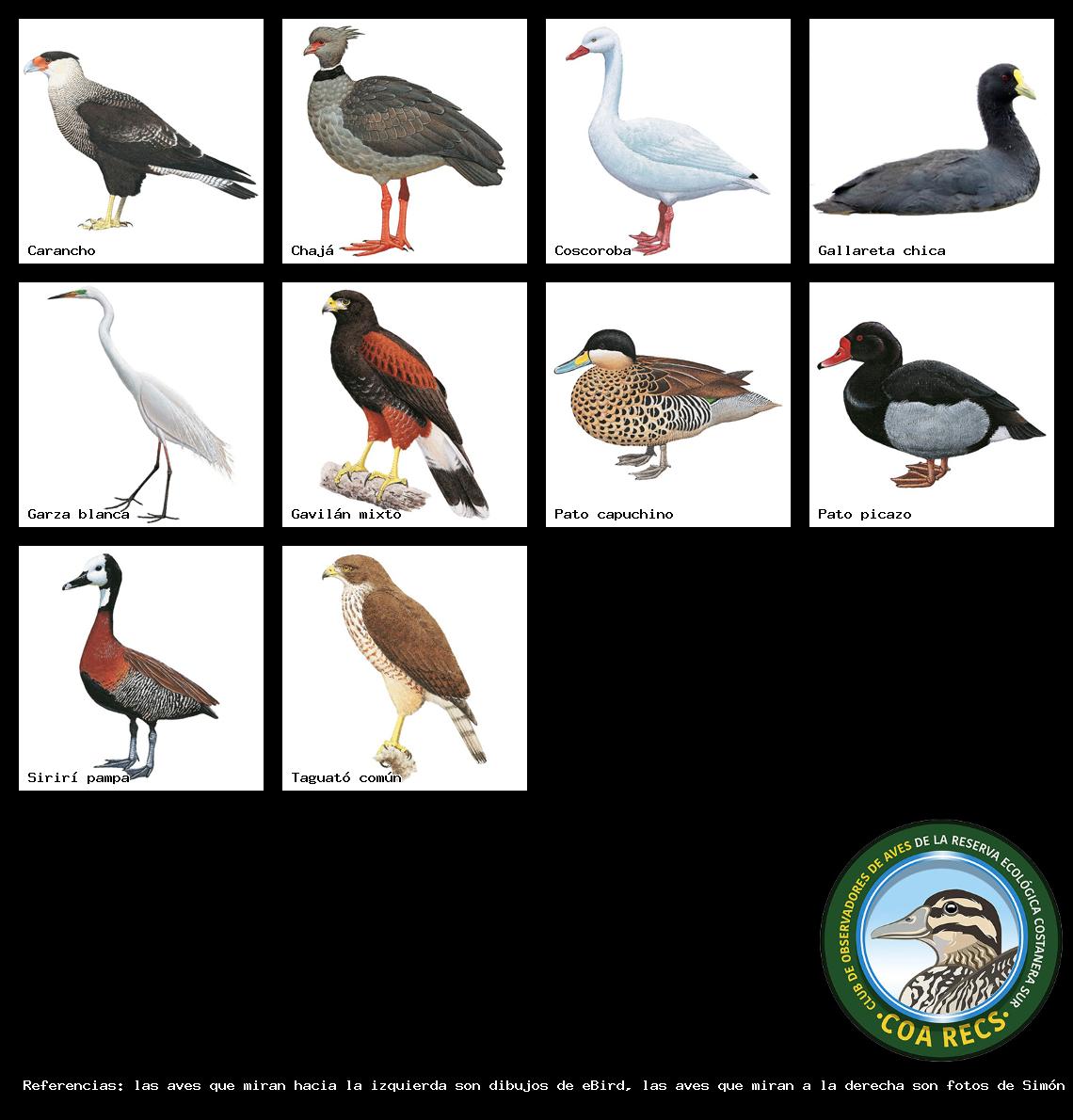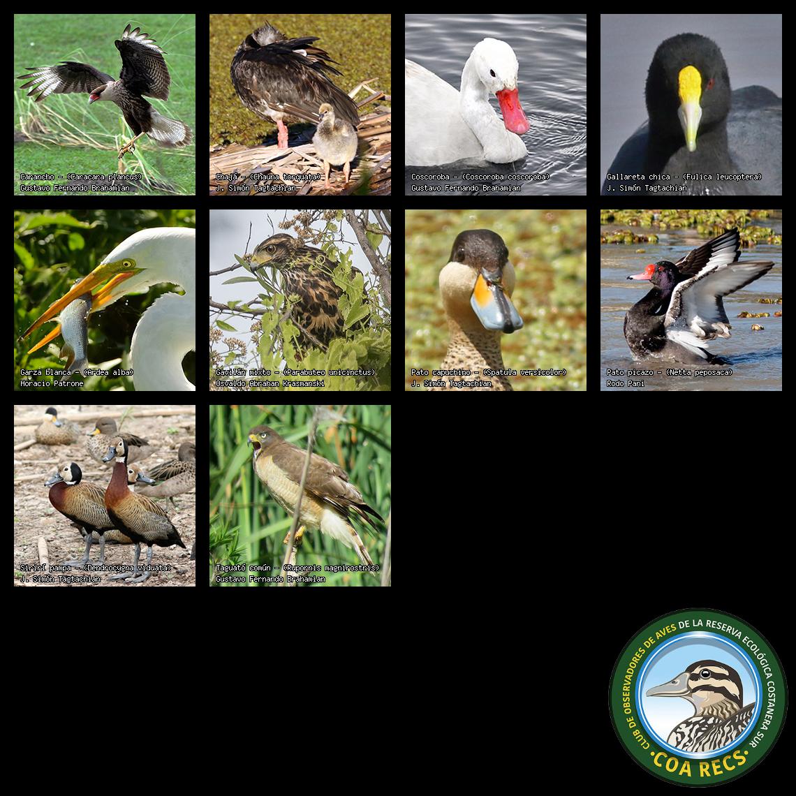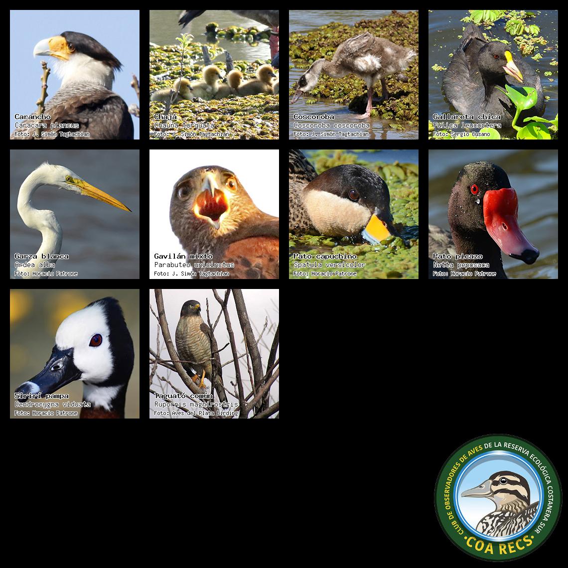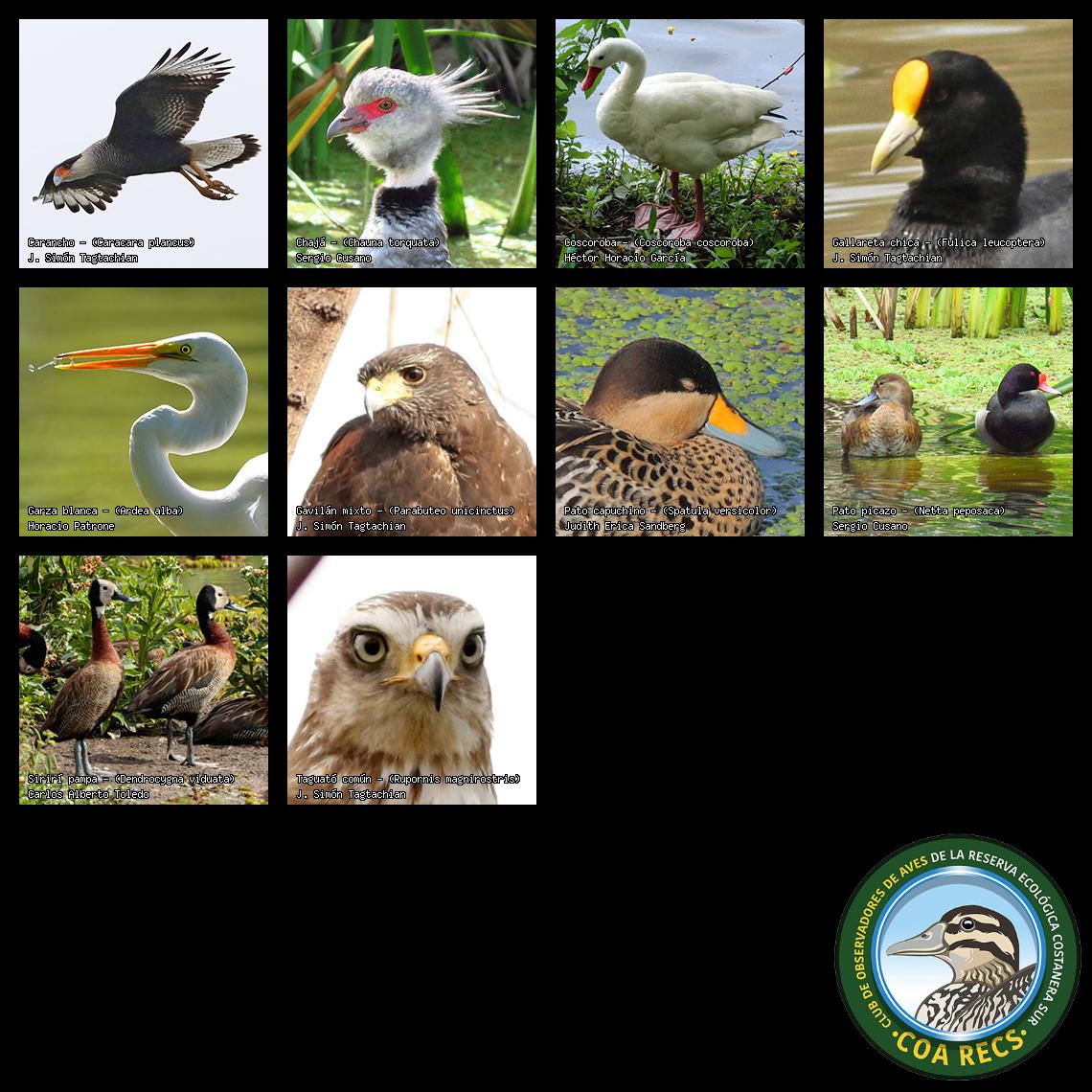 (Gavilán mixto, Carancho, Chimango, Benteveo común, Hornero, Carpintero real y Estornino pinto)