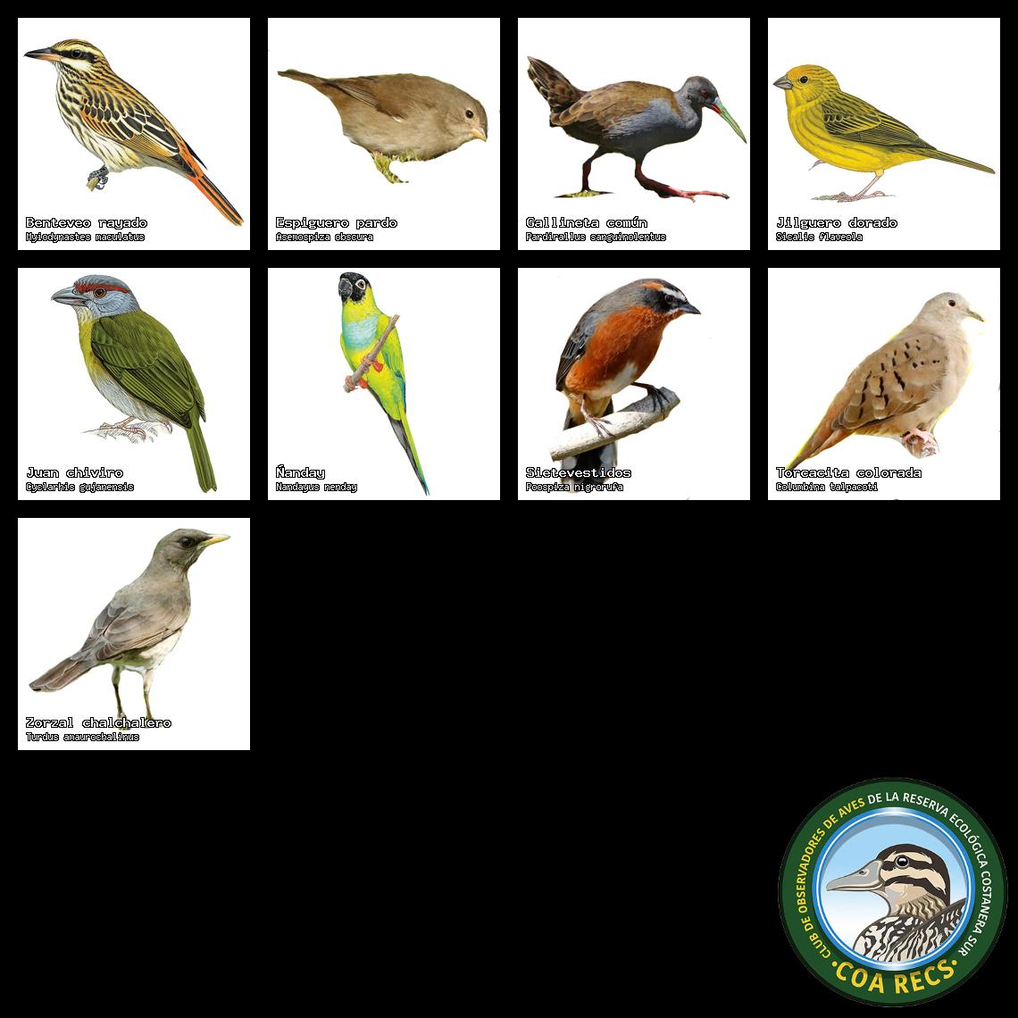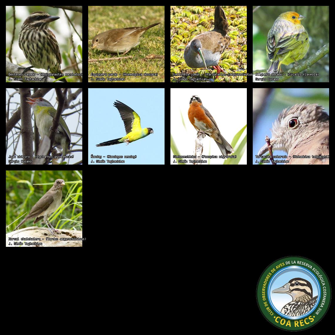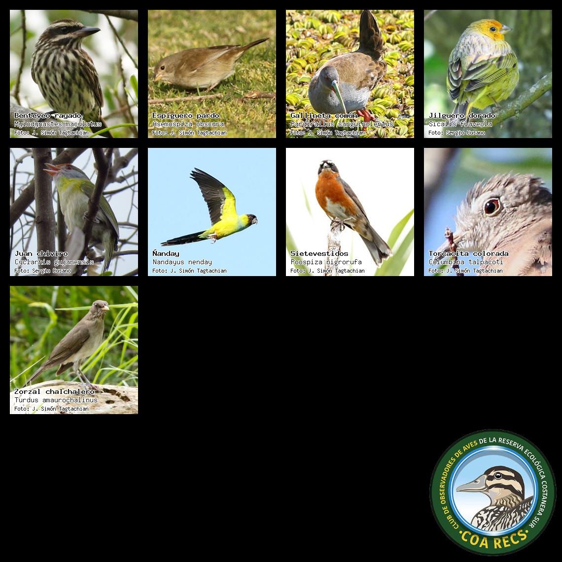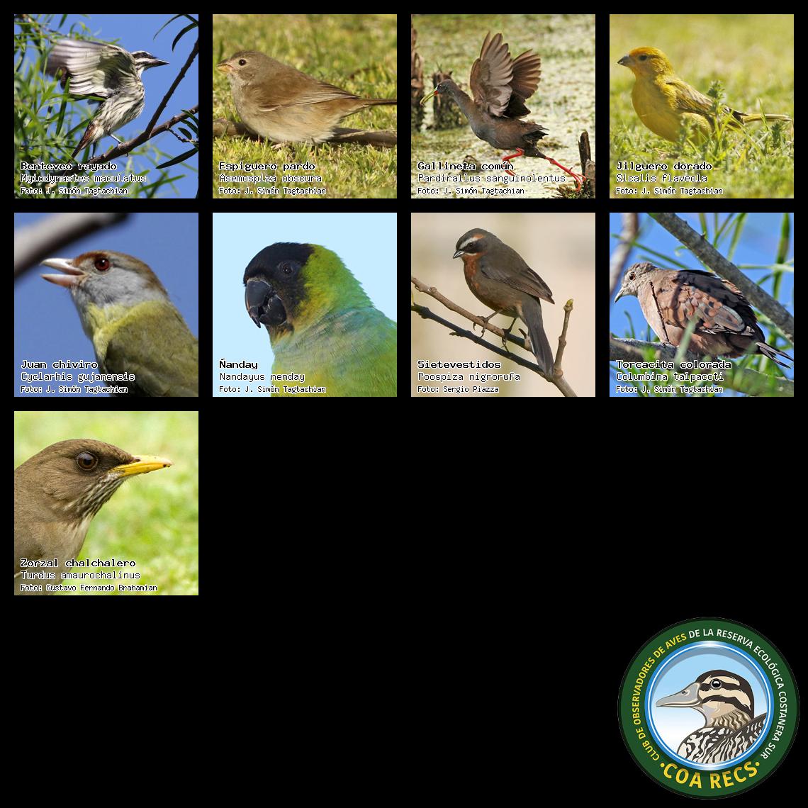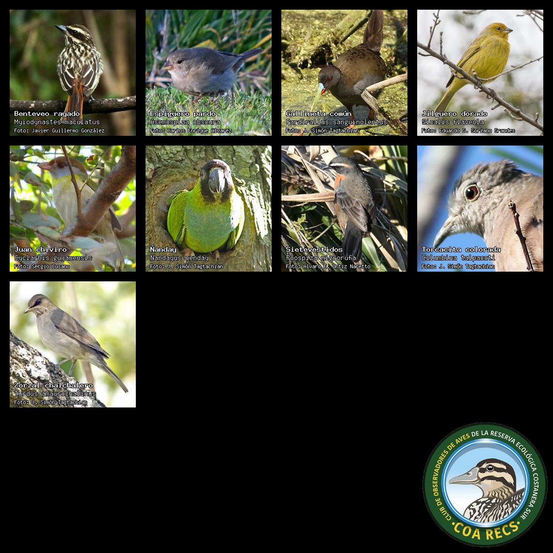 (Gavilán mixto, Carancho, Chimango, Benteveo común, Hornero, Carpintero real y Estornino pinto)