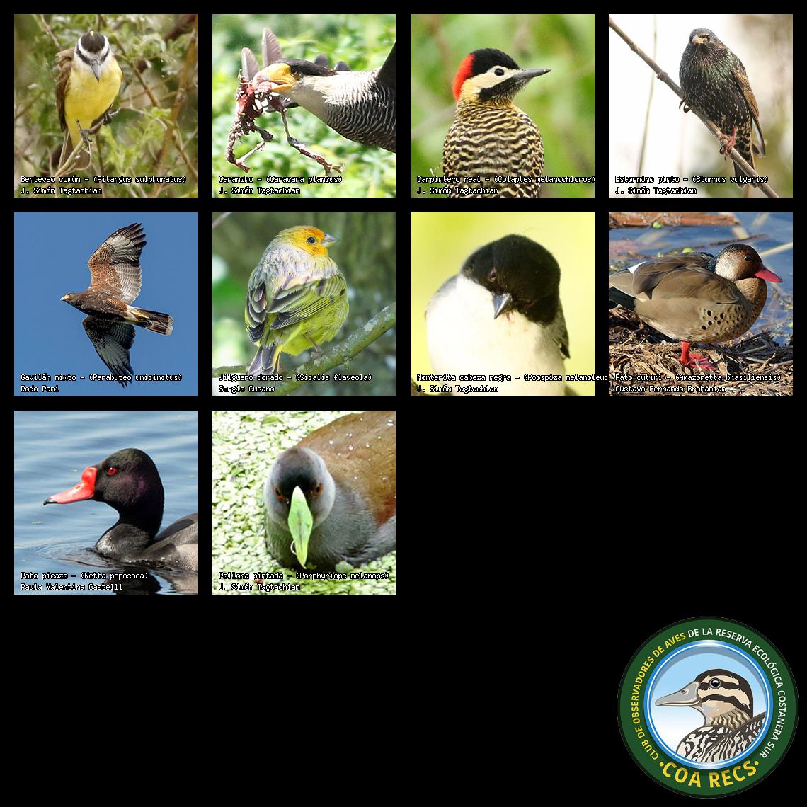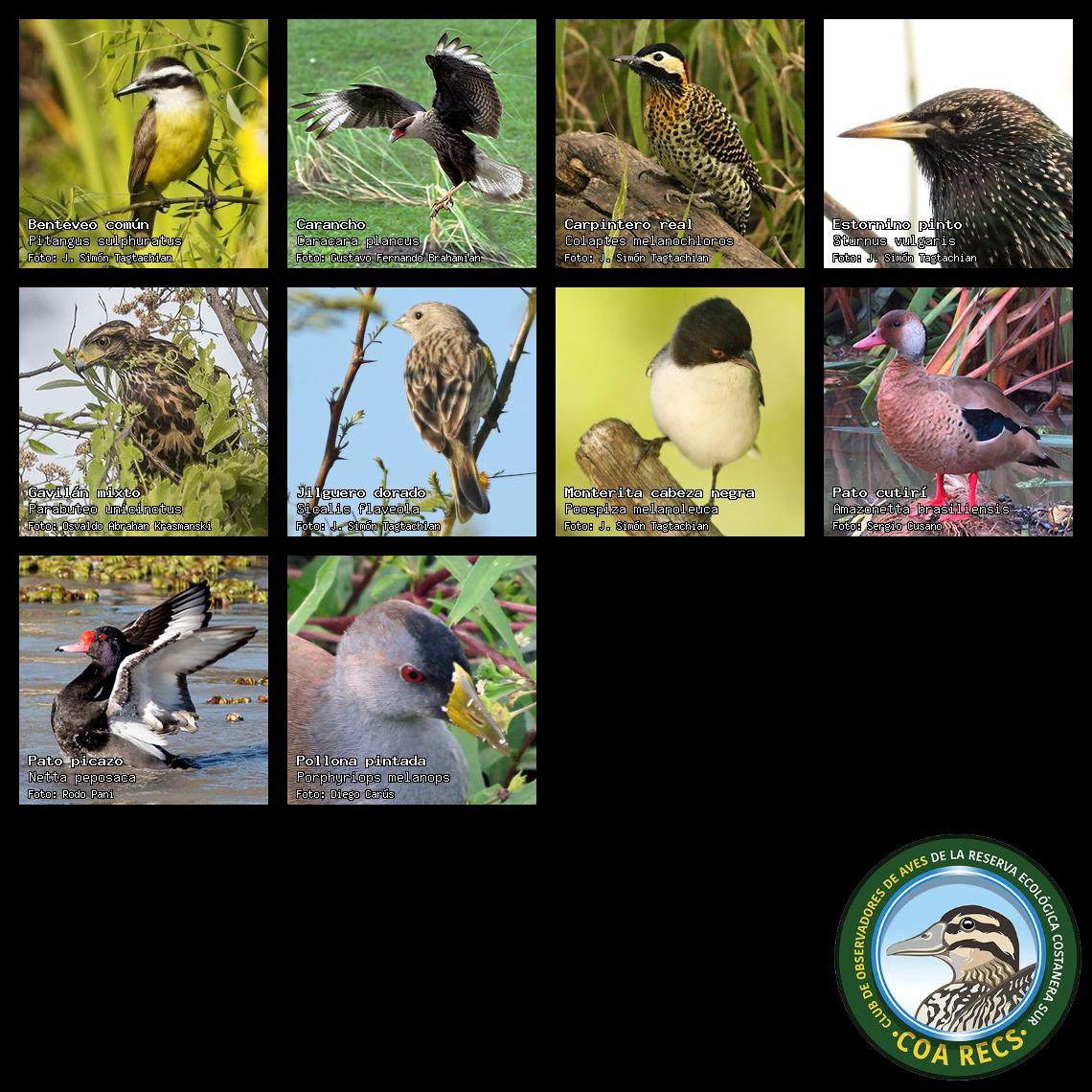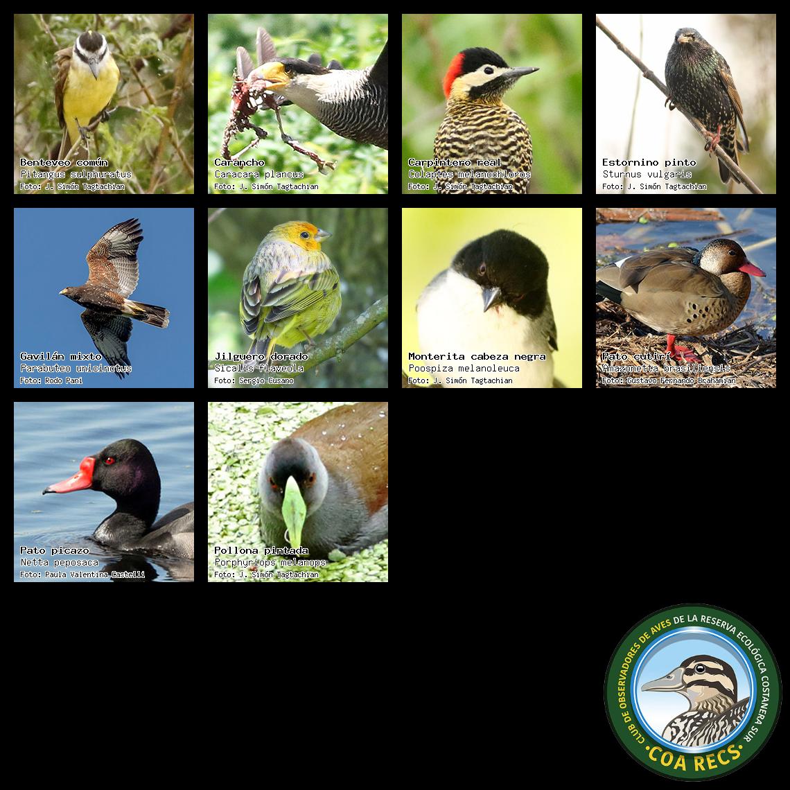 (Gavilán mixto, Carancho, Chimango, Benteveo común, Hornero, Carpintero real y Estornino pinto)